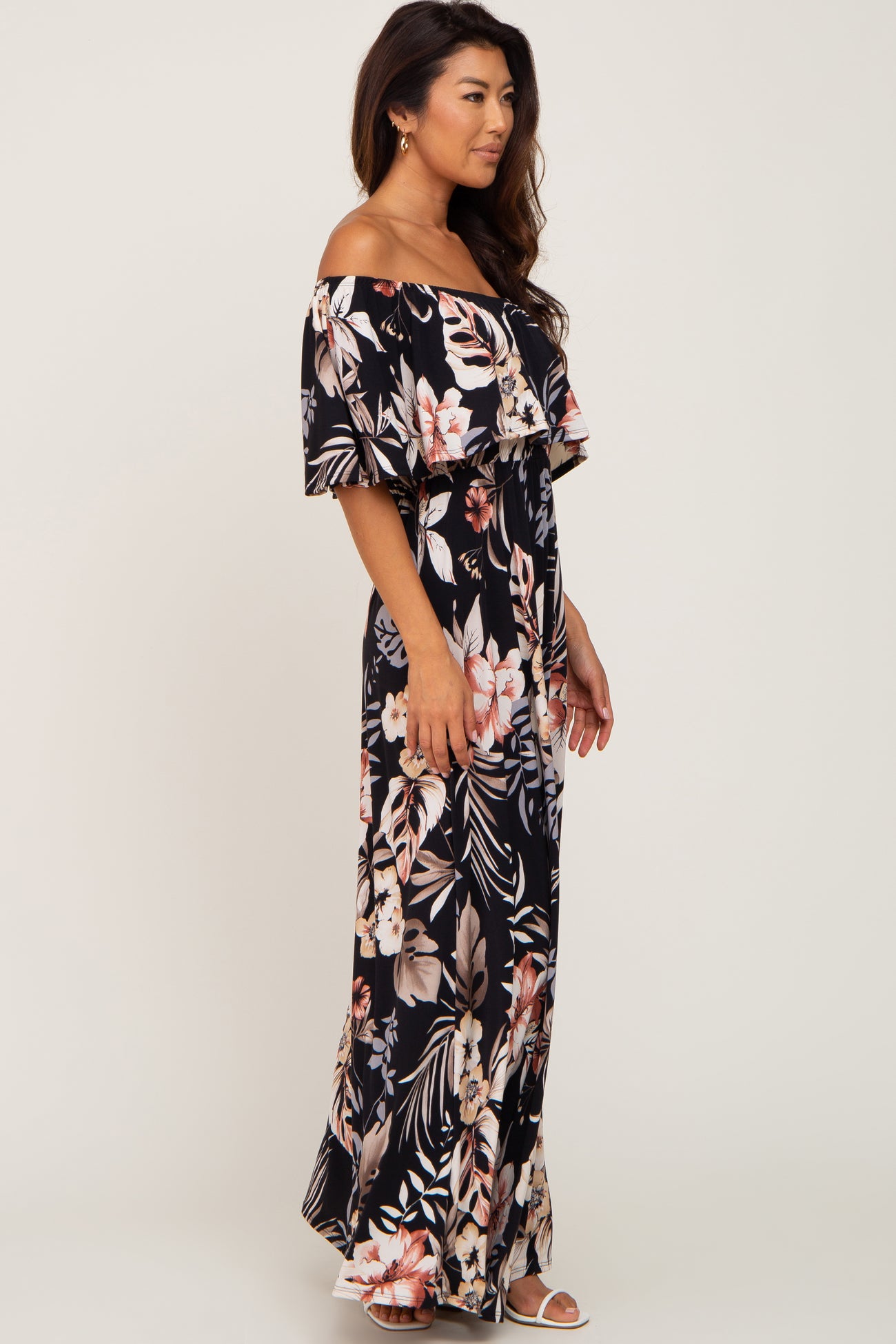 A floral print maxi dress with a flounce elastic off shoulder neckline and elastic waist.