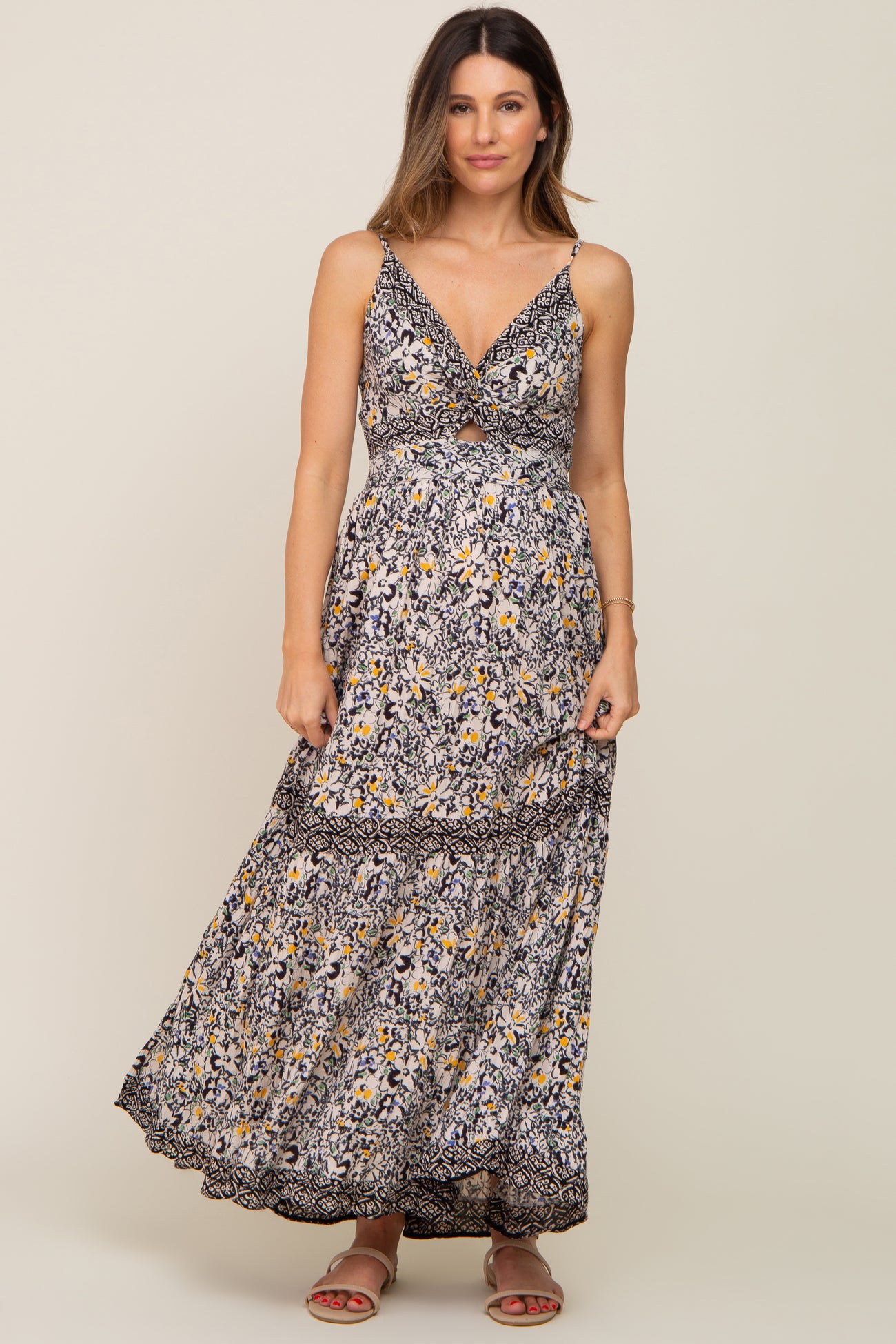 A floral maternity maxi that features adjustable straps, a v-neckline, a front twist, a smocked back, a front cutout, and a gathered bottom tier.