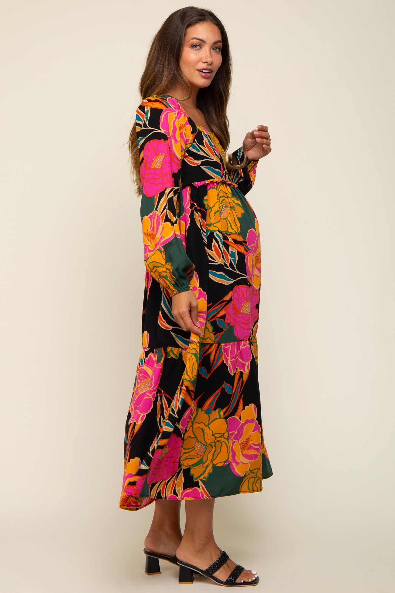 A floral maternity midi dress with a squared neckline, a smocked back, long puff sleeves, a ruffle accent under the bust, side pockets, and a gathered bottom tier.