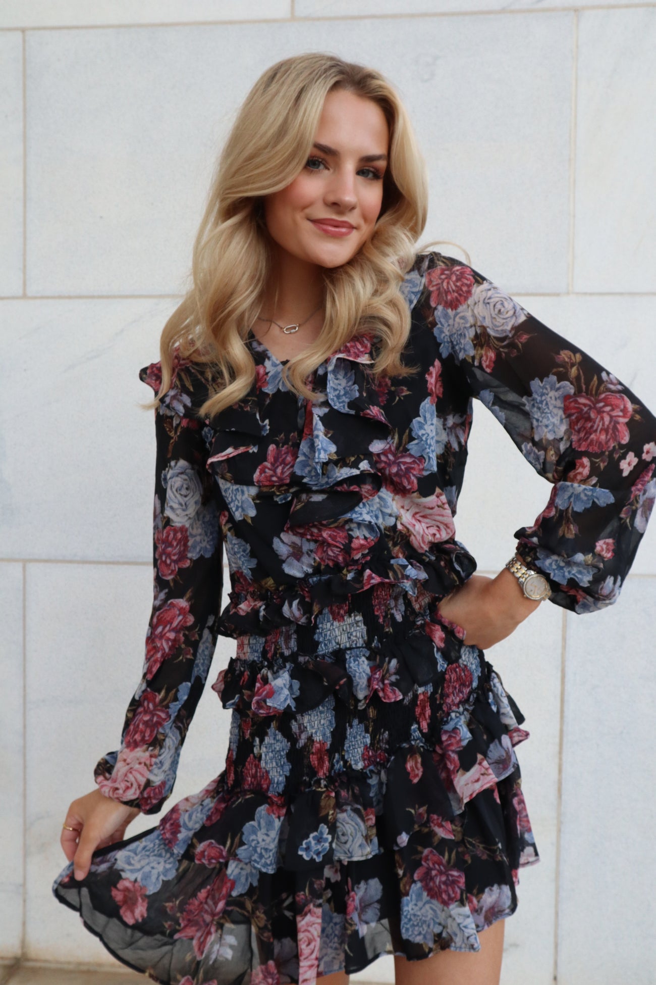 Black Floral Long Sleeve Ruffle Dress