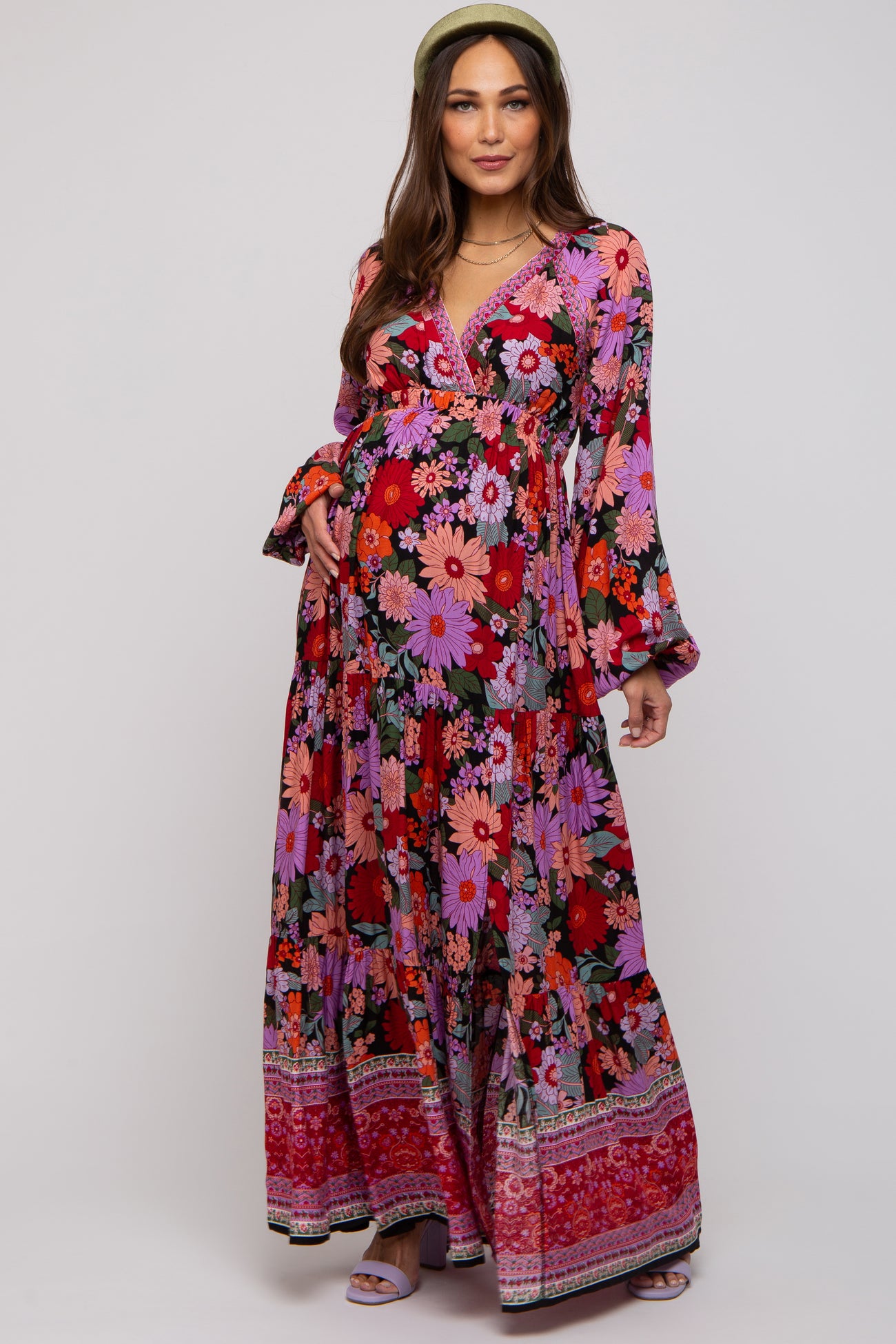 Black Floral Long Sleeve Tiered Maternity Maxi Dress