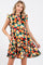 A floral print dress with ruffle mock neckline, ruffle accents and button keyhole opening in back. Pocketed.