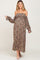 A floral maternity maxi dress featuring a smocked bodice, long sleeves, and off the shoulder neckline, and side pockets.