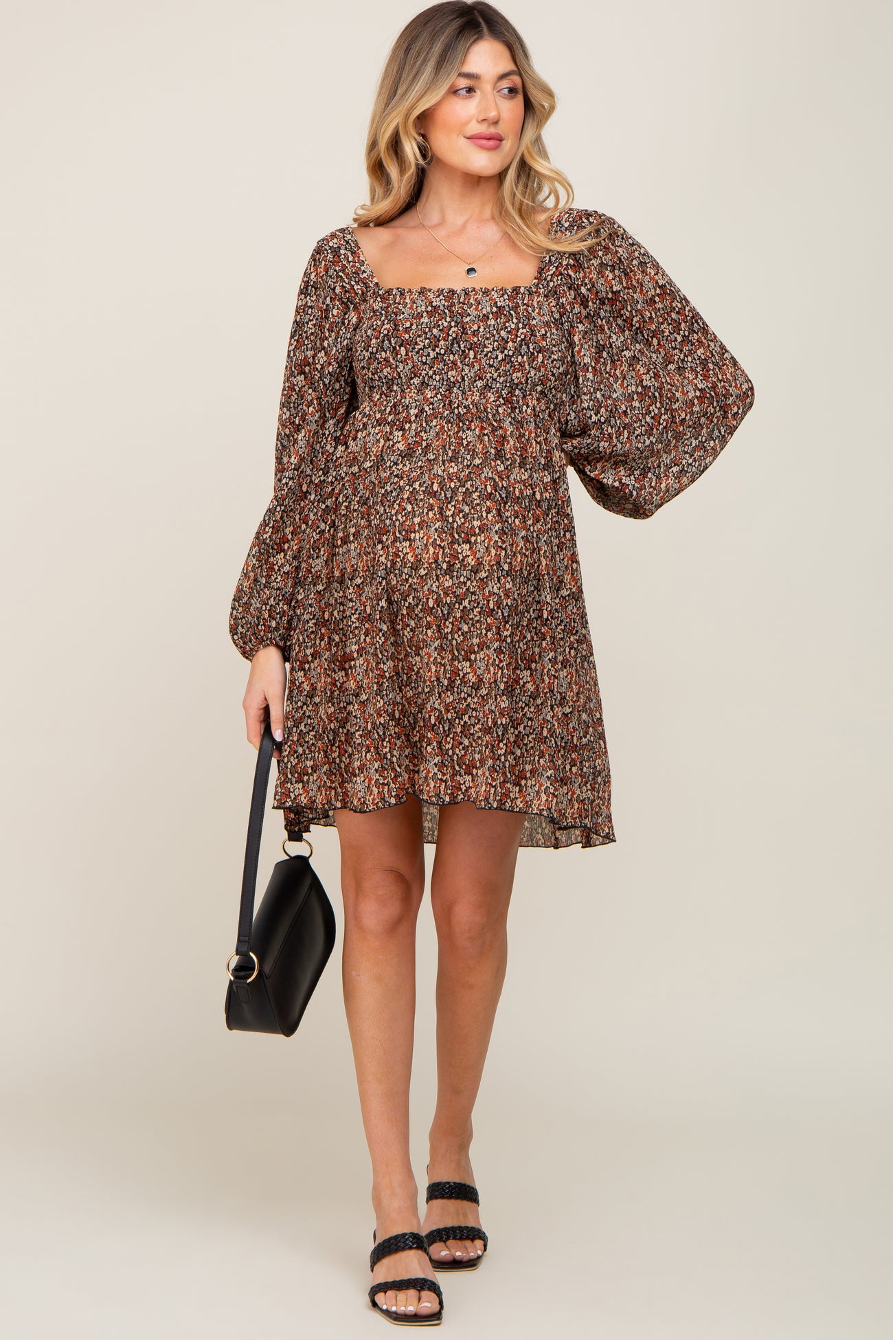 A printed empire waist dress. Pleated material. Smocked bust. Pockets. Cinched sleeves.