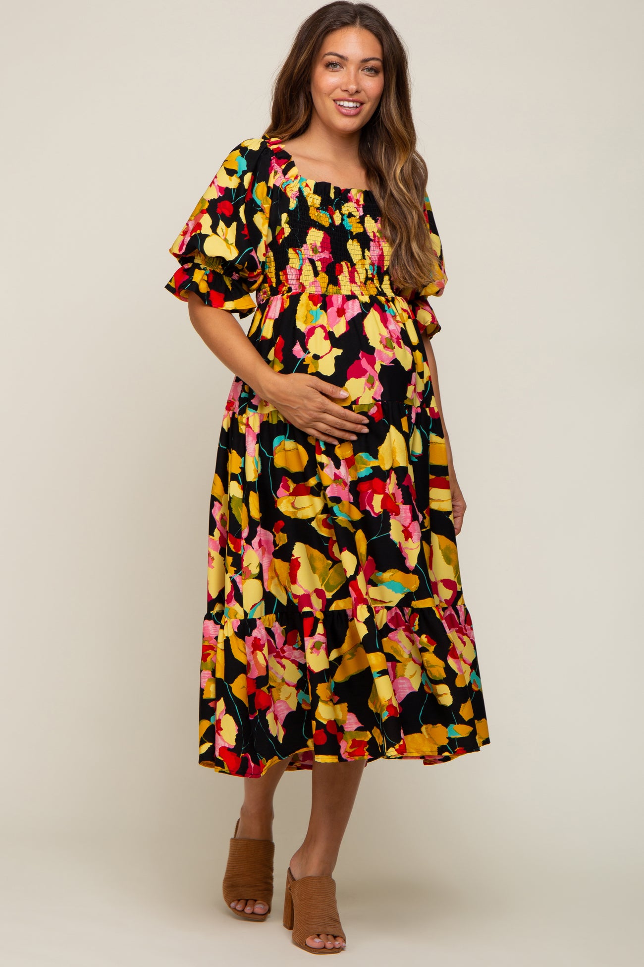 A floral print maternity midi dress featuring a smocked top, short, ruffled puff sleeves, a tiered skirt, a square neckline and a ruffle hem.