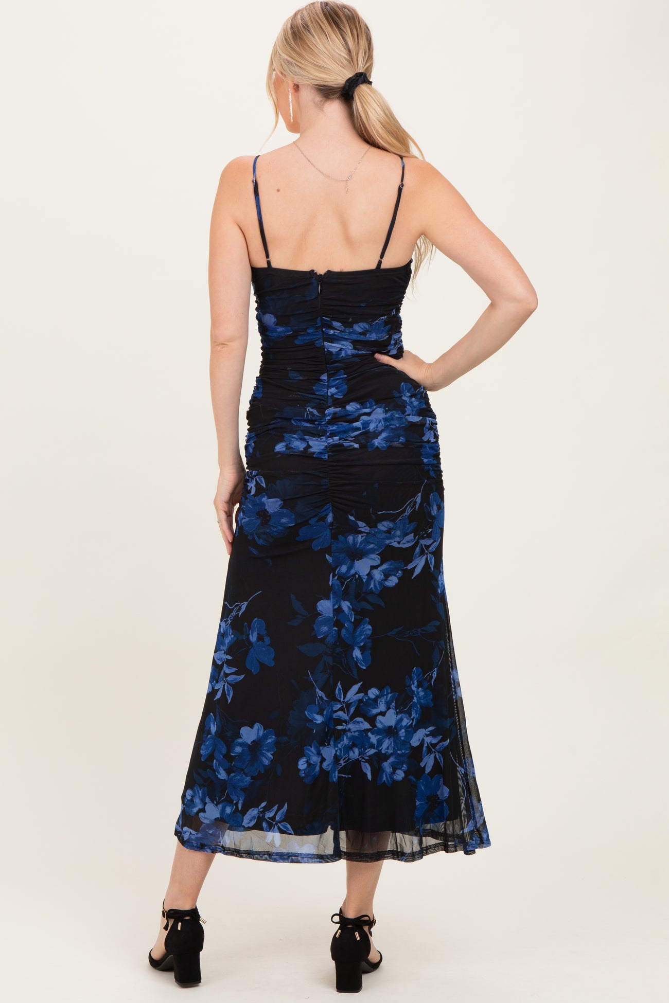 Black Floral Ruched Mesh Maxi Dress
