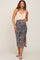 A printed maternity midi skirt with adjustable side ruching, side slit and elastic waistband.