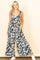 A sleeveless floral jumpsuit featuring ruffle shoulder straps, a cutout back, side pockets and a square neckline.