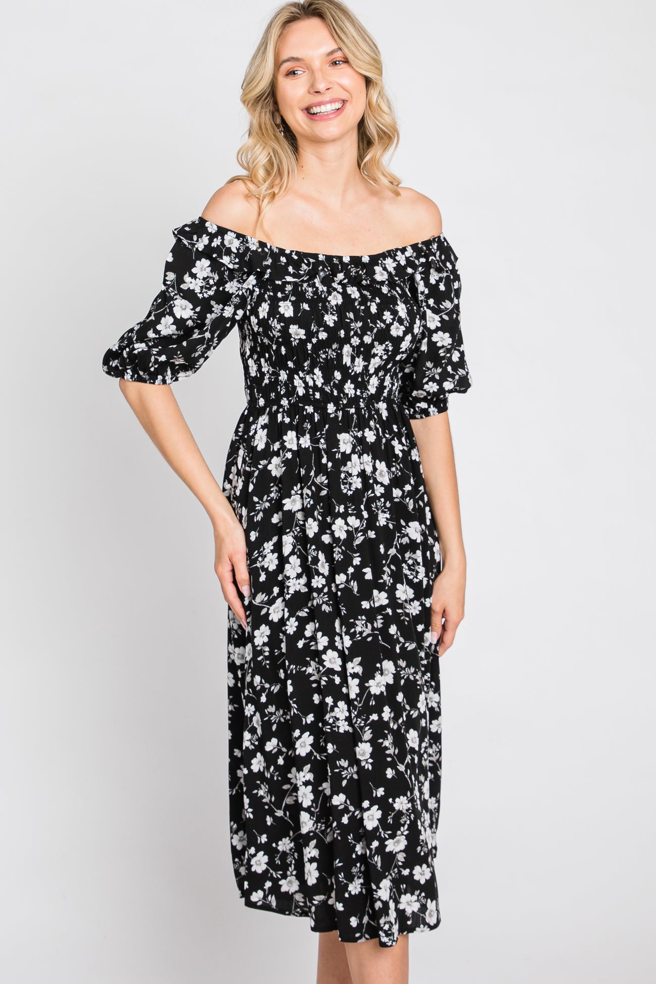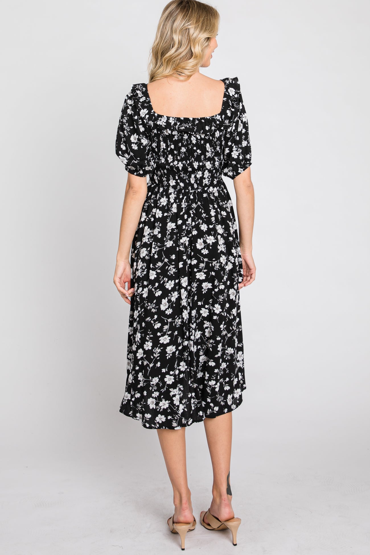 Black Floral Smocked Puff Sleeve Midi Dress