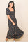 A floral print midi dress featuring a smocked top, short puff sleeves, side pockets, a ruffle hem and a square neckline.