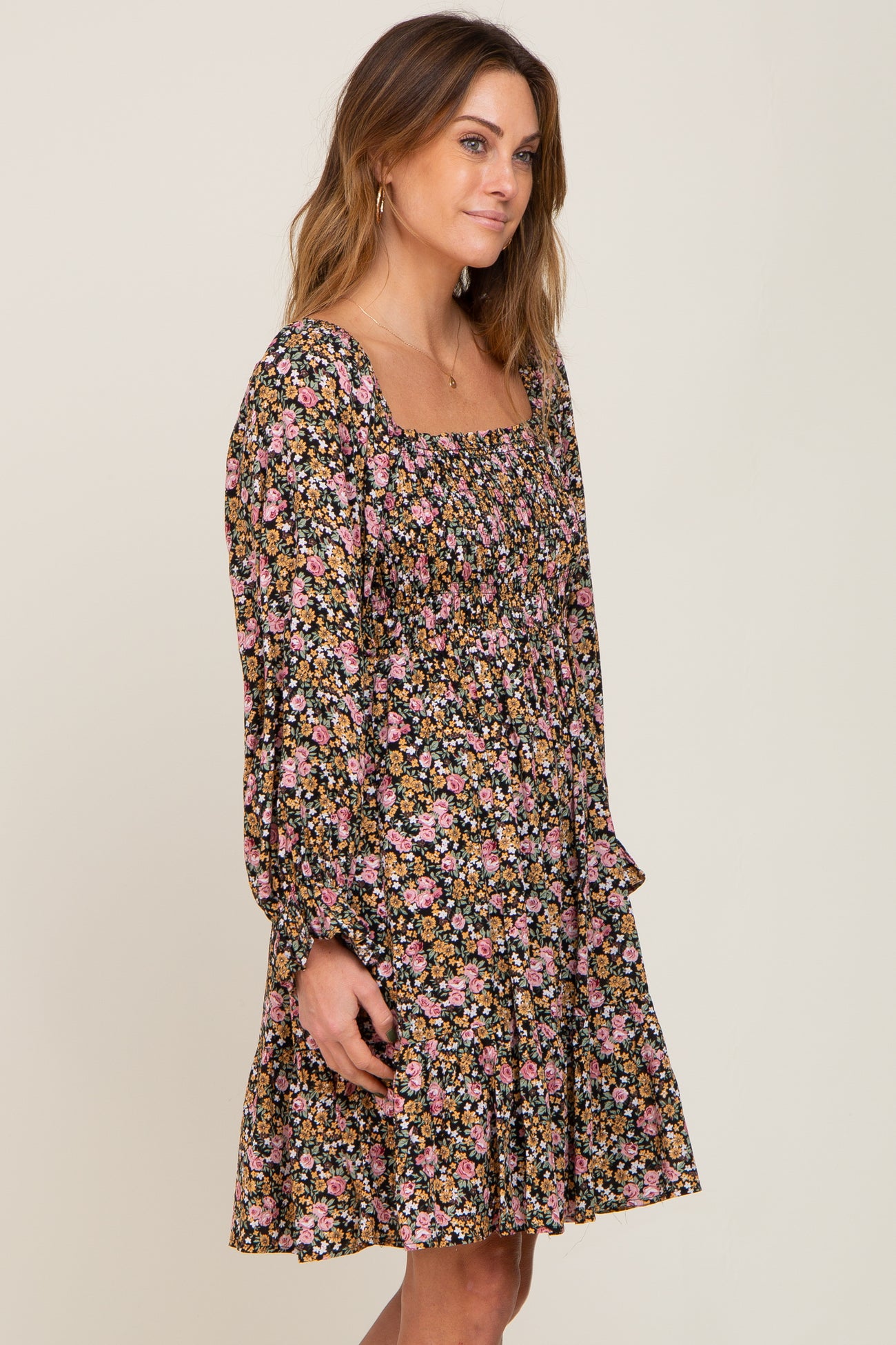 Details A floral dress featuring a square neckline, a smocked elastic top, long puff sleeves, side pockets and a ruffle hem. Content + Care