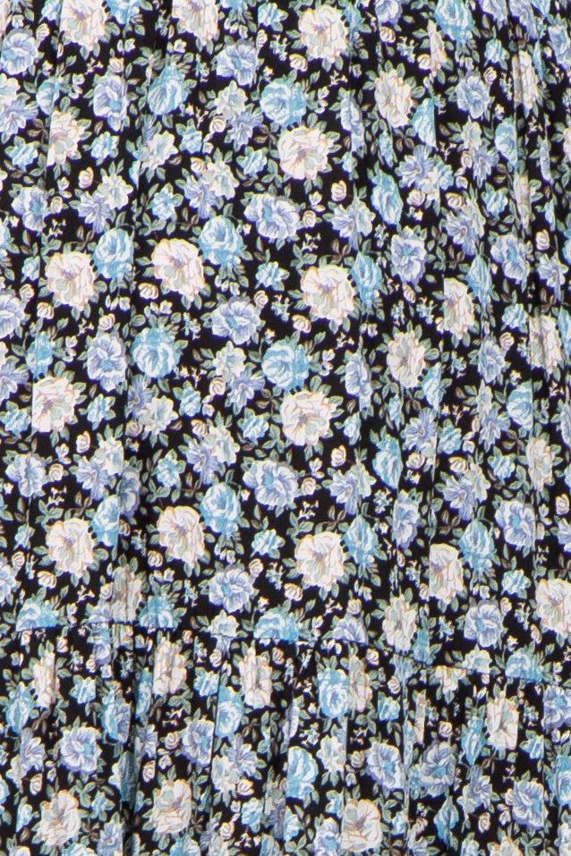 A lightweight floral print maternity midi dress with puff sleeves, smocked bodice and tiered skirt. Pocketed.