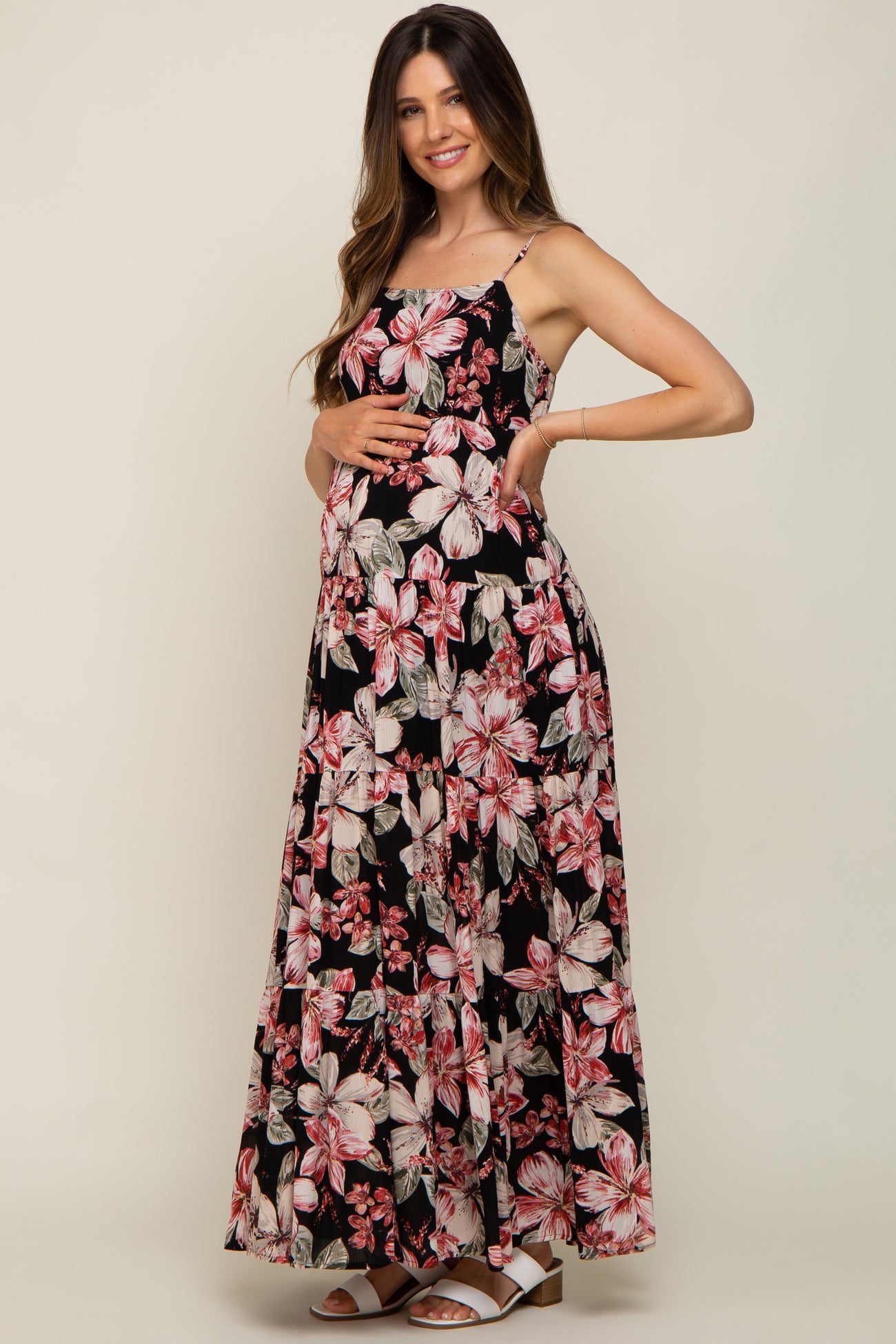 Black Floral Square Neck Tiered Maternity Maxi Dress