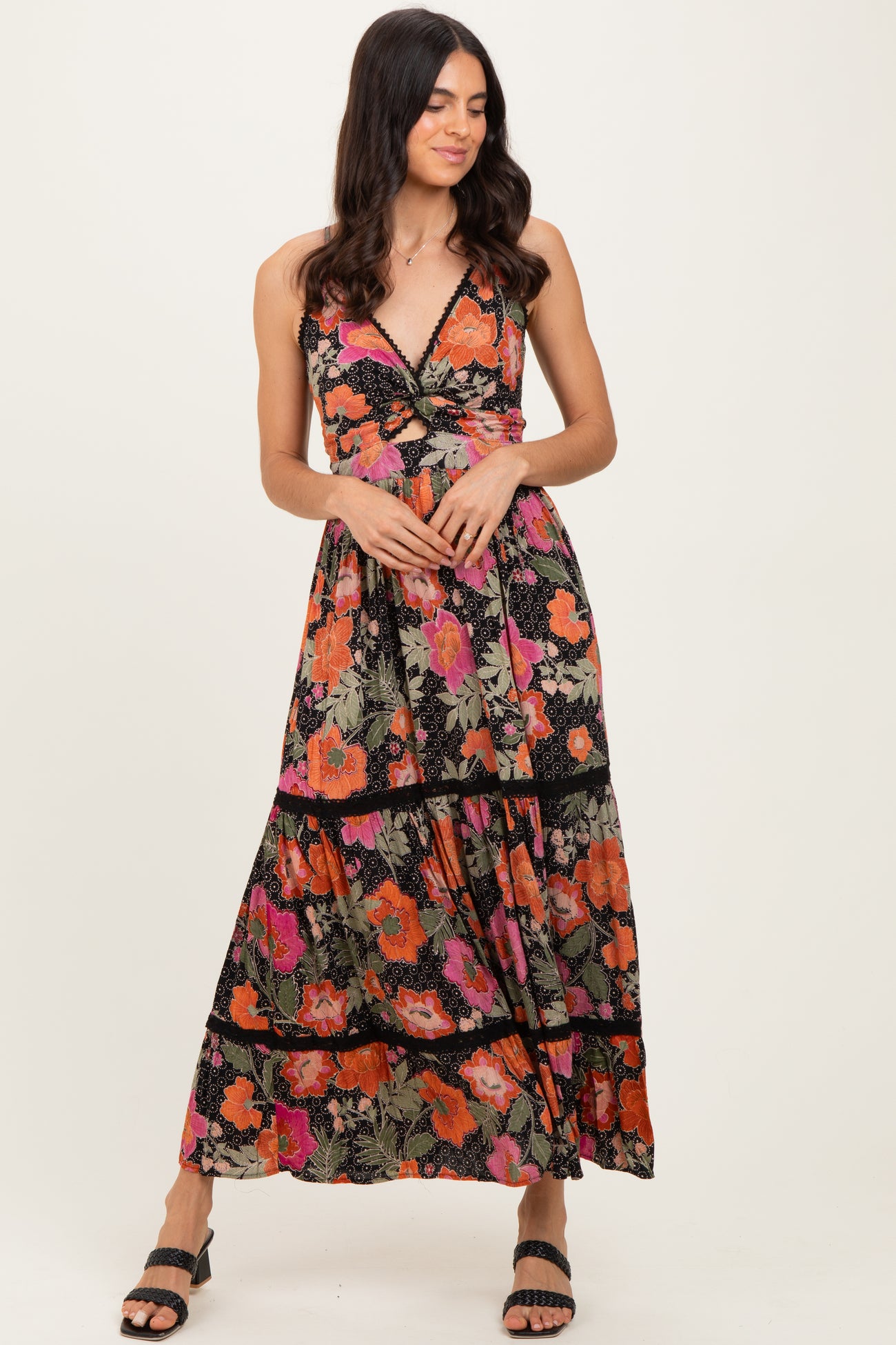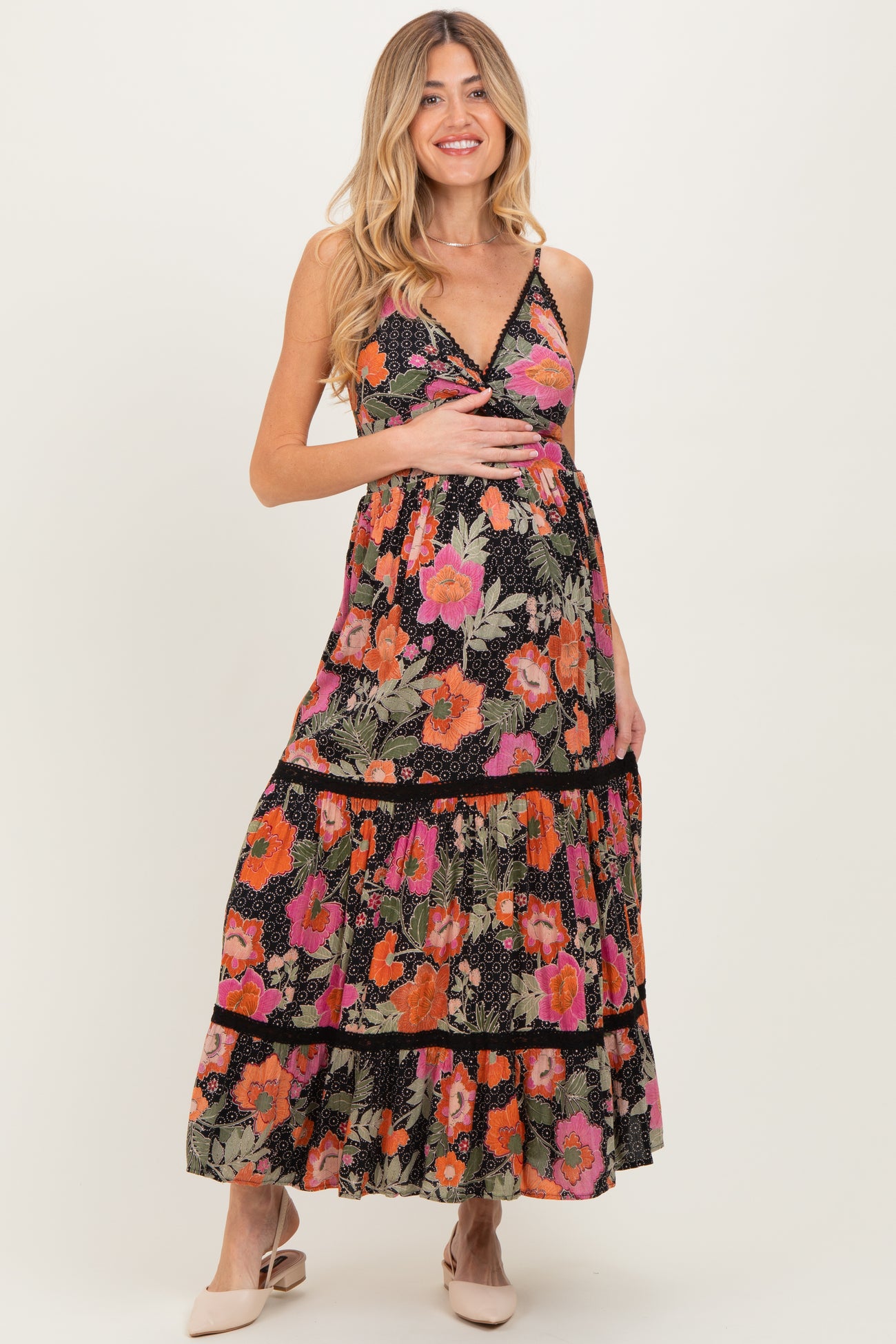 Black Floral Twisted Front Lace Detail Maternity Maxi Dress