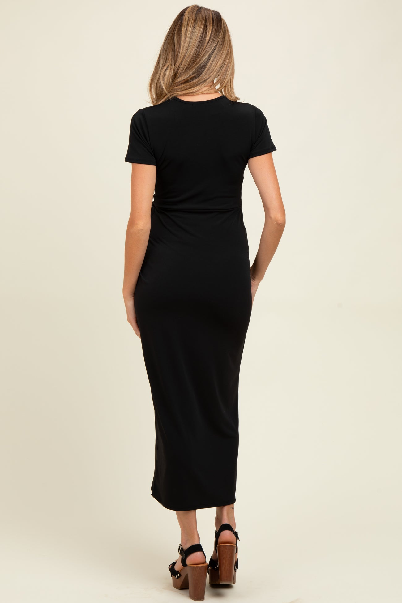 Black Gathered Front Short Sleeve Maternity Maxi Dress