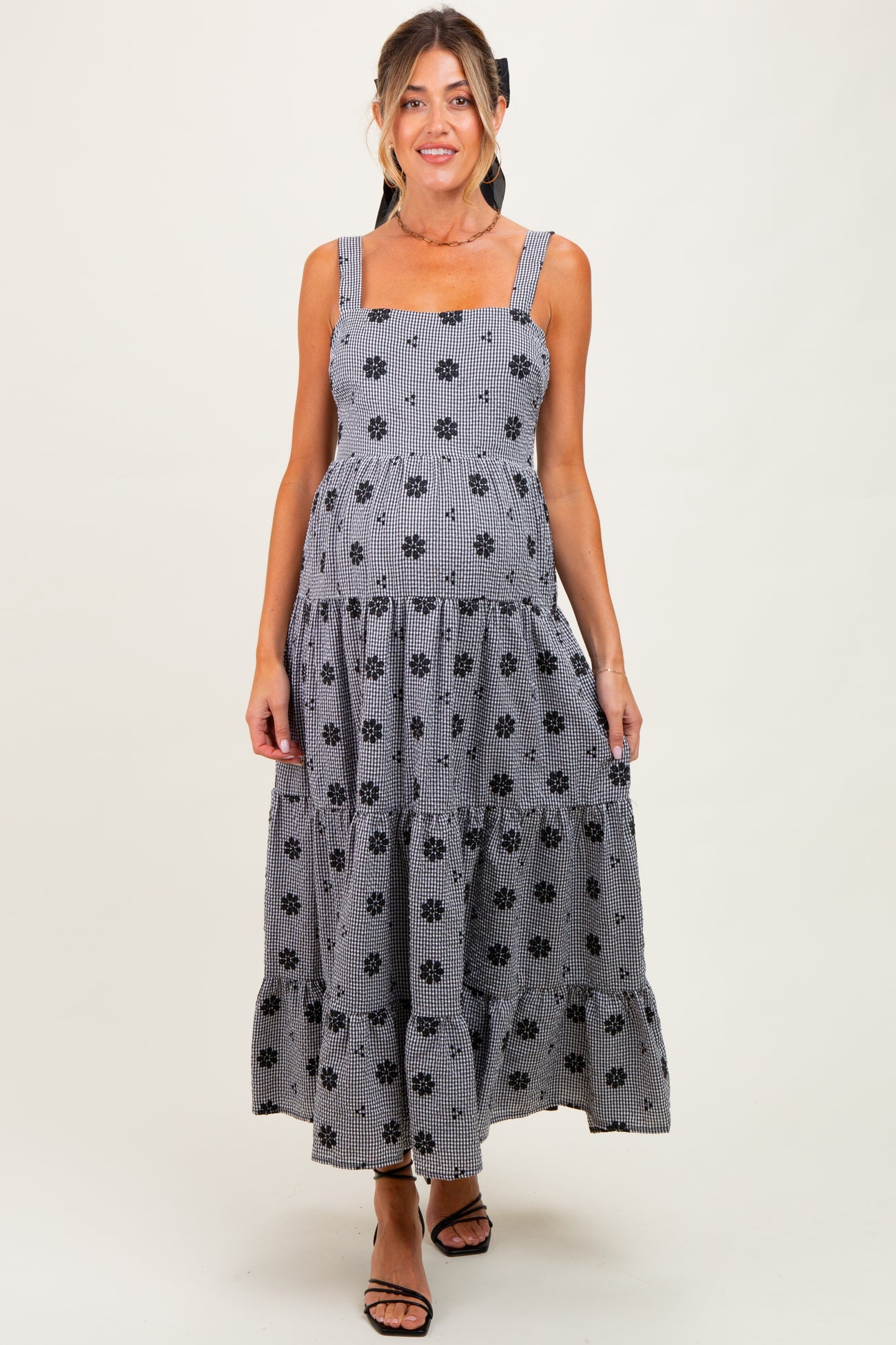 Black Gingham Floral Embroidered Maternity Maxi Dress