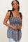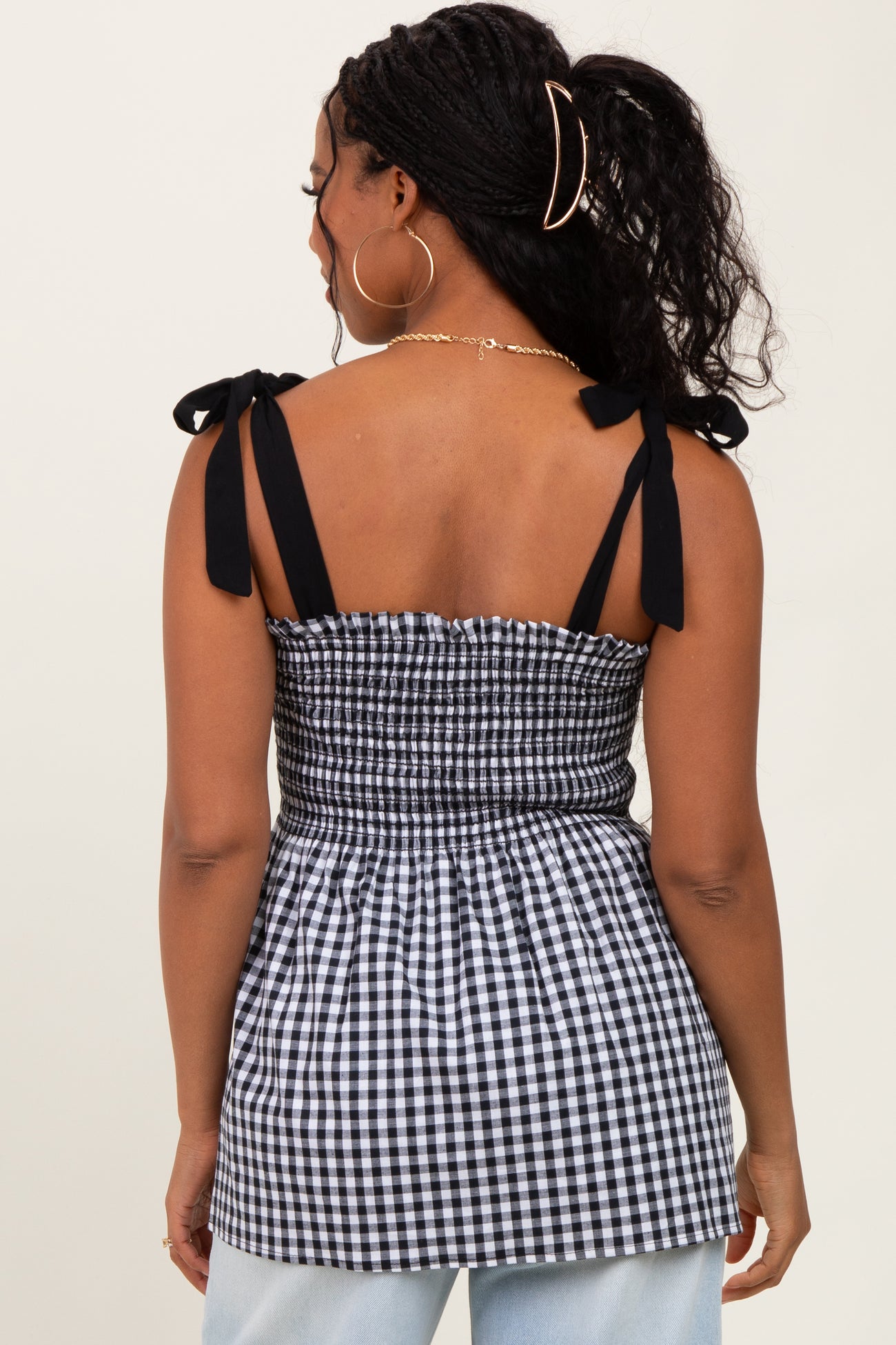 Elevate your casual wardrobe with our Black Gingham Smocked Shoulder Tie Top. Featuring a classic black and white gingham print, this top combines timeless charm with modern style. The smocked bodice offers a comfortable, stretchy fit that flatters every shape, while the adjustable shoulder ties add a playful, feminine touch. Crafted from lightweight, breathable fabric, it’s perfect for warm weather outings or layering under a jacket. Pair it effortlessly with your favorite jeans or shorts for an easy, chic look. Embrace a blend of comfort and style with this must-have summer staple!