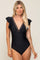 A one-piece swimsuit featuring a v-neckline with ladder trim, ruffle sleeves, a back cutout with a clasp closure and removeable padding.