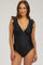 A solid swimsuit featuring a v-neckline, ruched sides, adjustable straps, back cut out and a ruffle trim detail. Bra pads are removable.