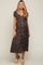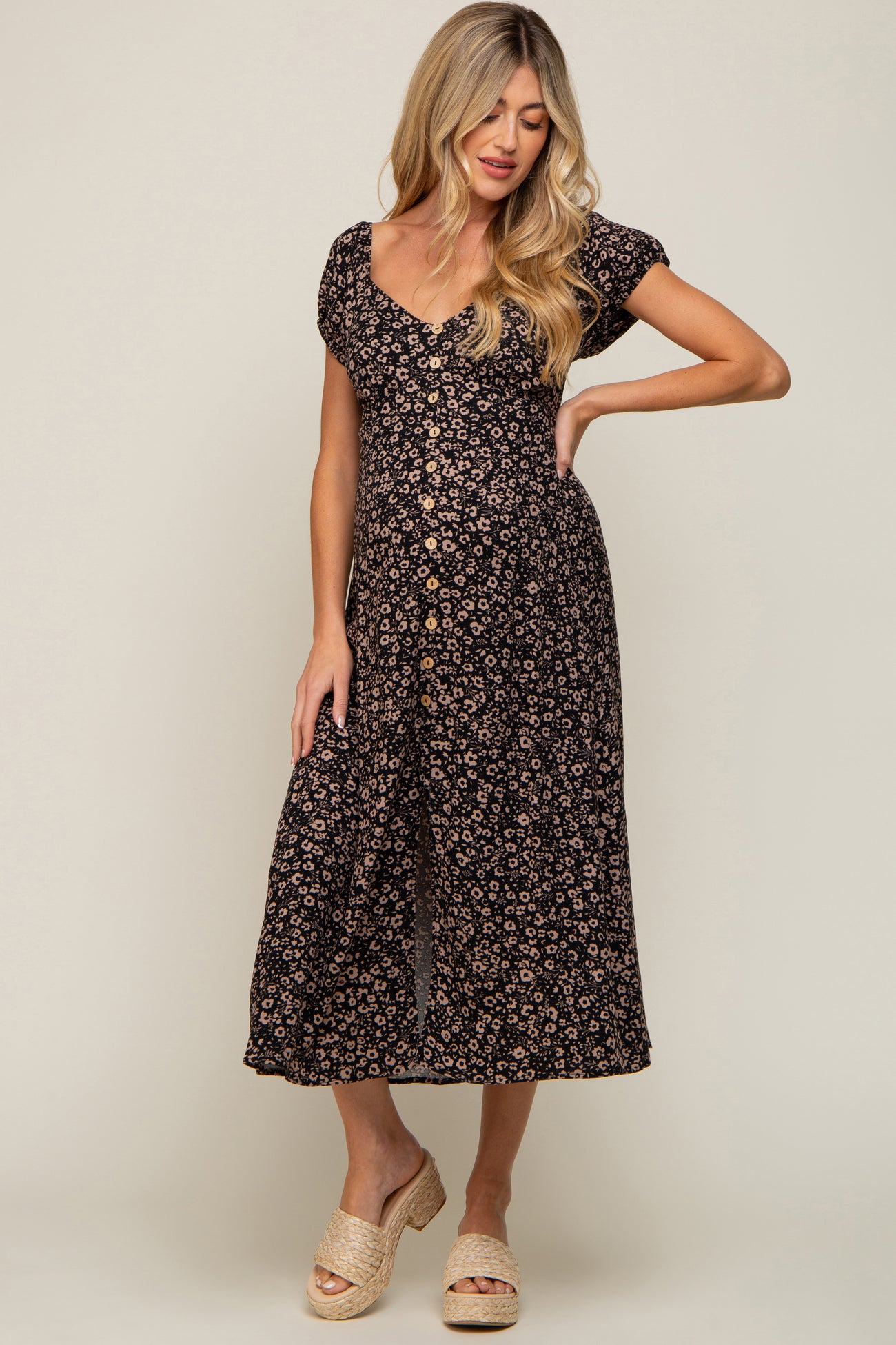 Details A leopard print maternity midi dress featuring a v-neckline, short puff sleeves, a button front and a center front slit. Content + Care