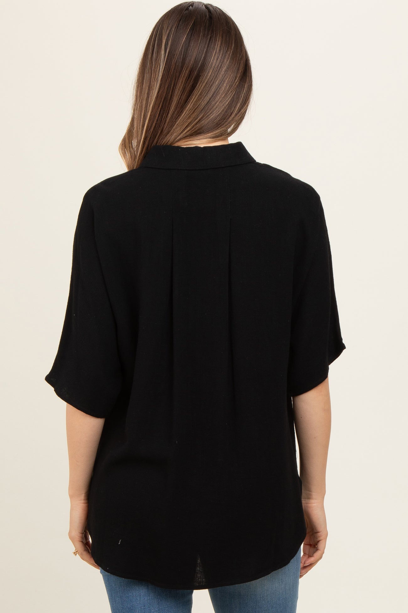 Black Linen Dolman Half Sleeve Button Down Maternity Top