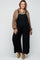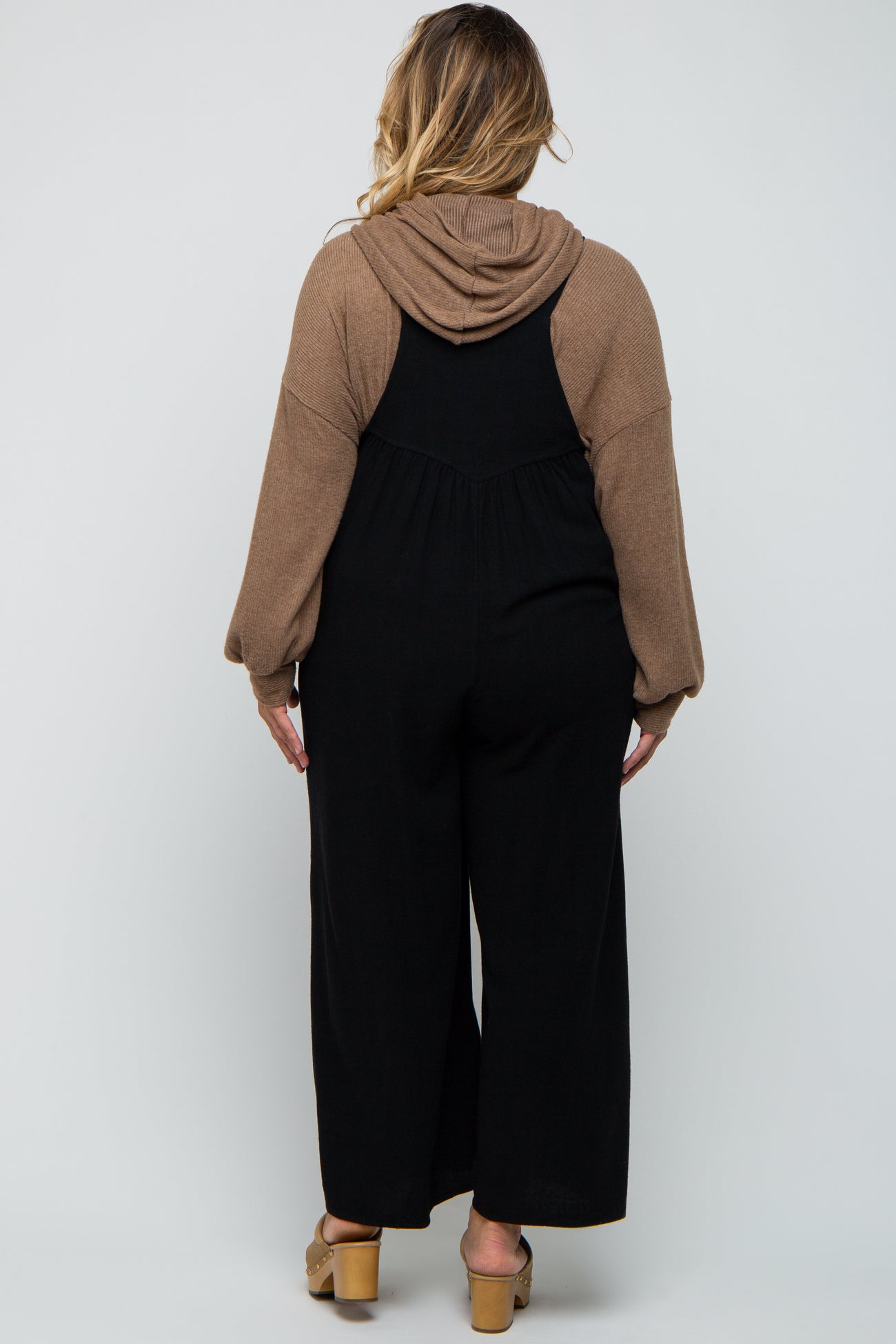 Solid linen maternity plus size overalls with a double button closure on straps, a ruched bust accent, two side pockets, and a square neckline.