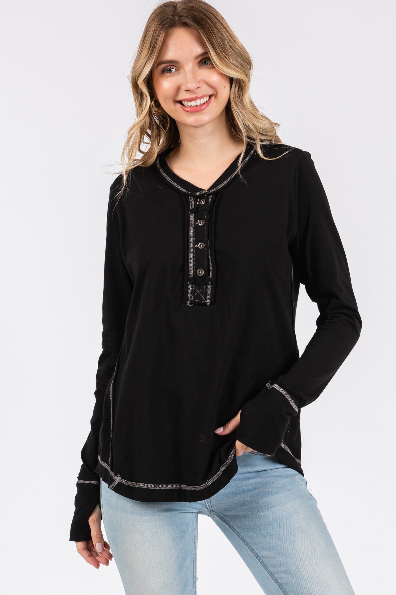 A solid hued maternity top featuring long sleeves with thumb holes, an exposed seam, front buttons and a curved hem.