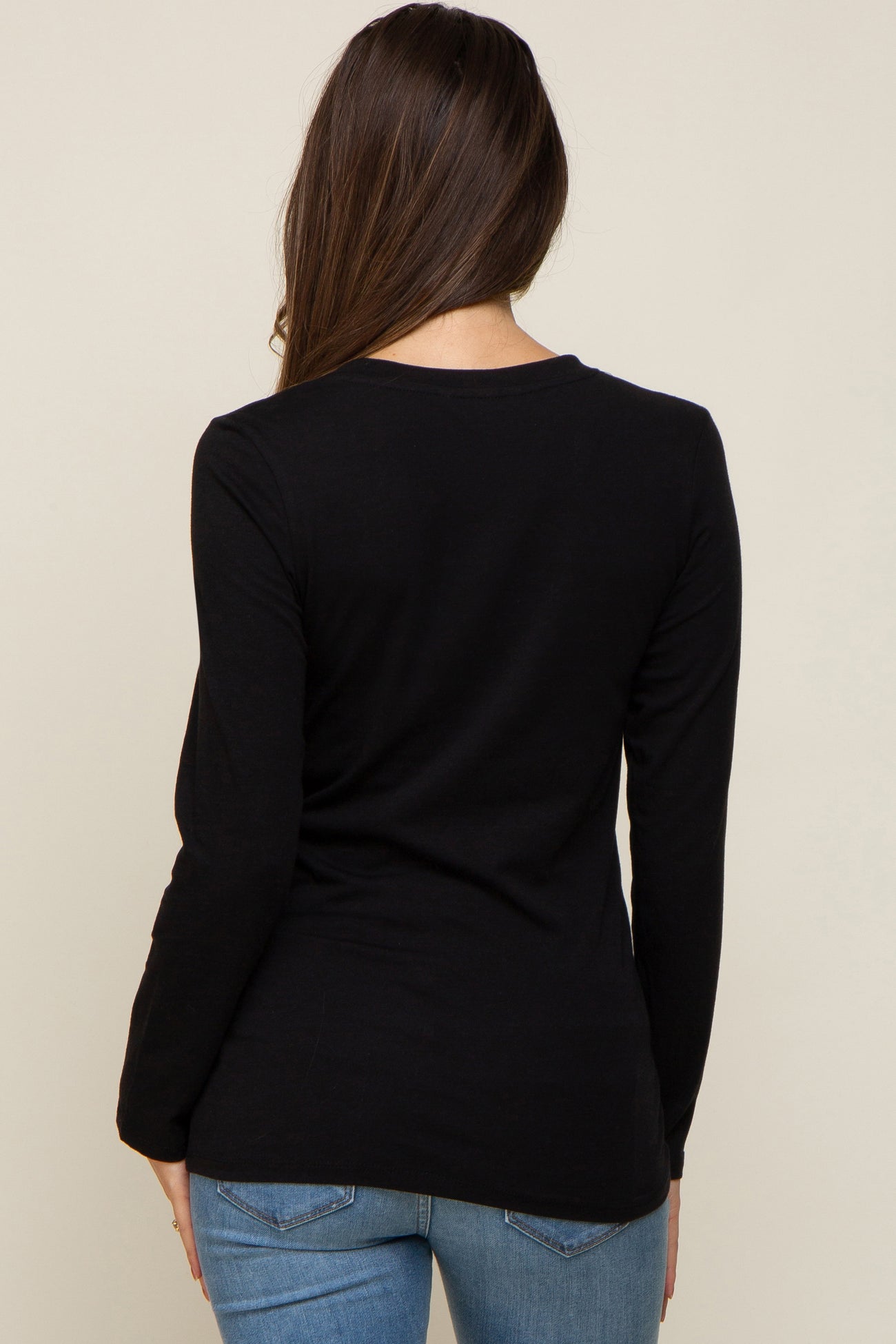 A solid maternity top featuring long sleeves and a rounded neckline.