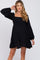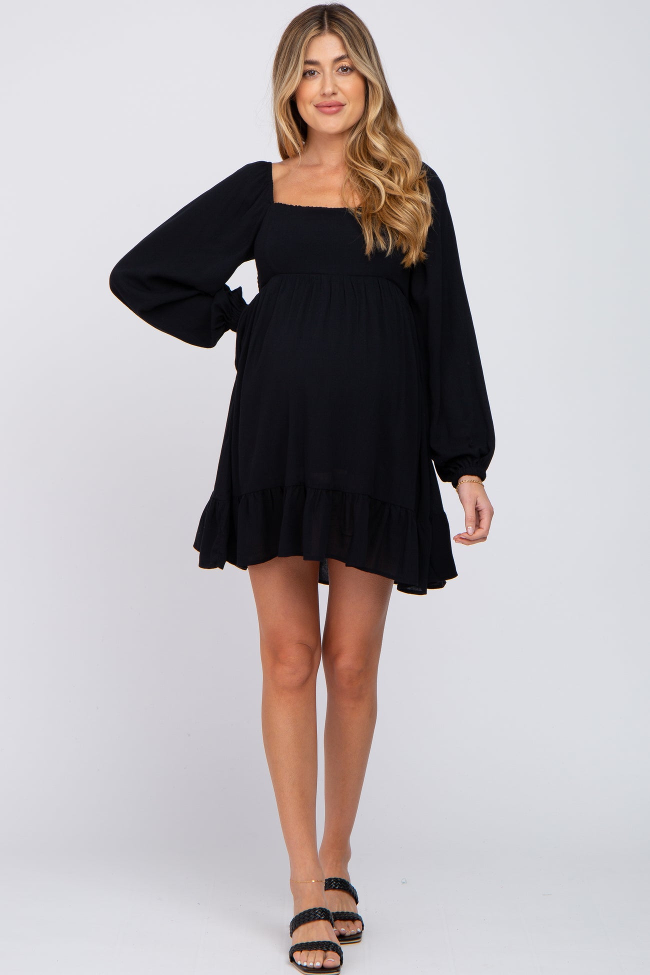 A solid hued maternity dress featuring long sleeves, a smocked back, a ruffle hem and a square neckline.