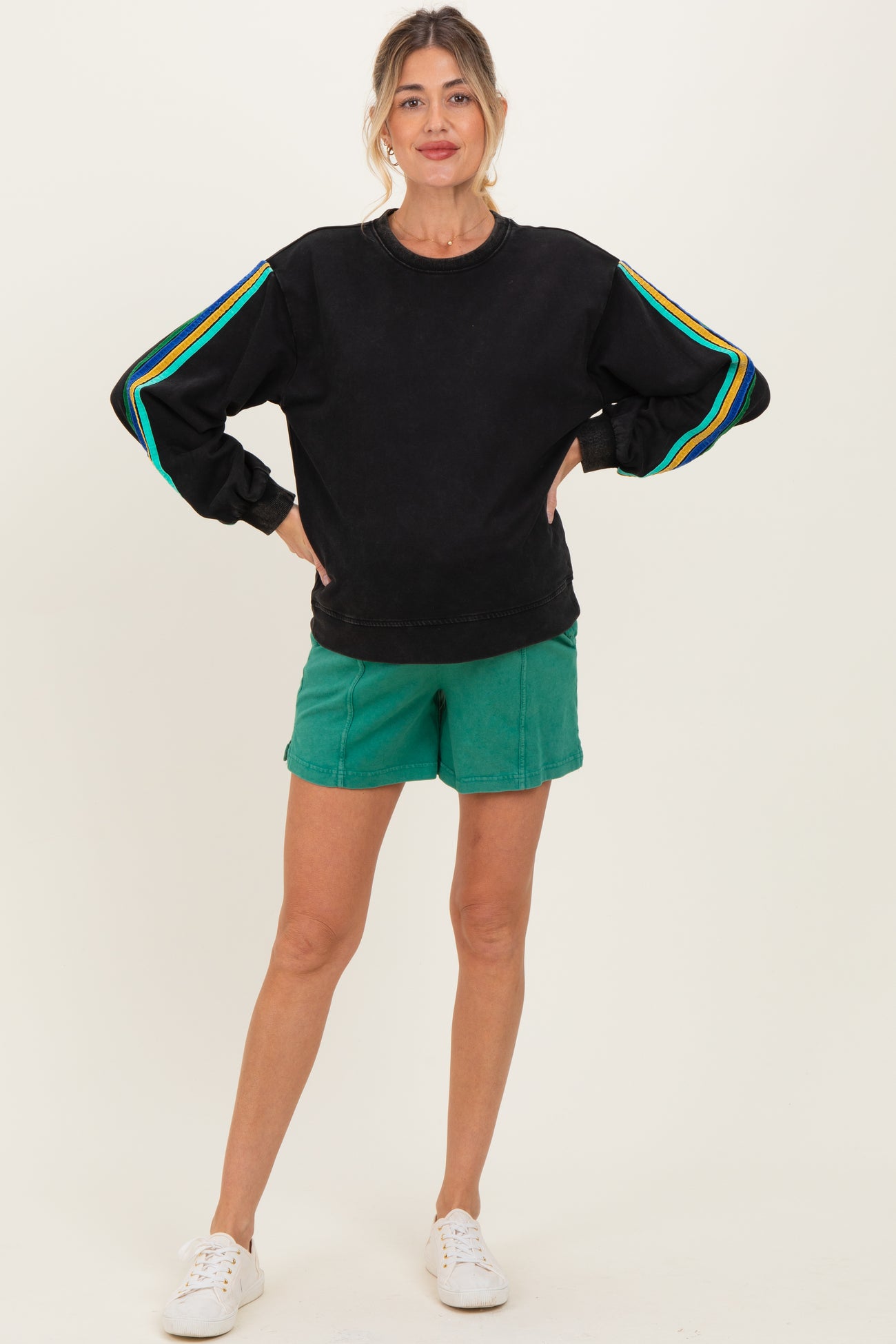 Stay cozy and stylish throughout your pregnancy with our Black Mineral Wash Velvet Stripe Detail Maternity Sweatshirt. Designed with a relaxed fit and soft mineral wash fabric, this sweatshirt adapts comfortably as your bump grows. The bold velvet stripes in bright colors on the sleeves add a fun, sporty edge to your casual maternity wardrobe. Ribbed cuffs and hem ensure a snug, flattering fit, while the durable material keeps you warm and comfortable all day long. Perfect for layering or wearing on its own, this versatile piece is a must-have for every mom-to-be!