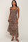 A floral sleeveless maxi dress featuring self-tie shoulder straps, a smocked top, a tiered skirt, side pockets and a square neckline.