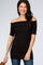 A solid hued fitted top featuring a ribbed texture, an off shoulder neckline, fitted sleeves and a lettuce trim.