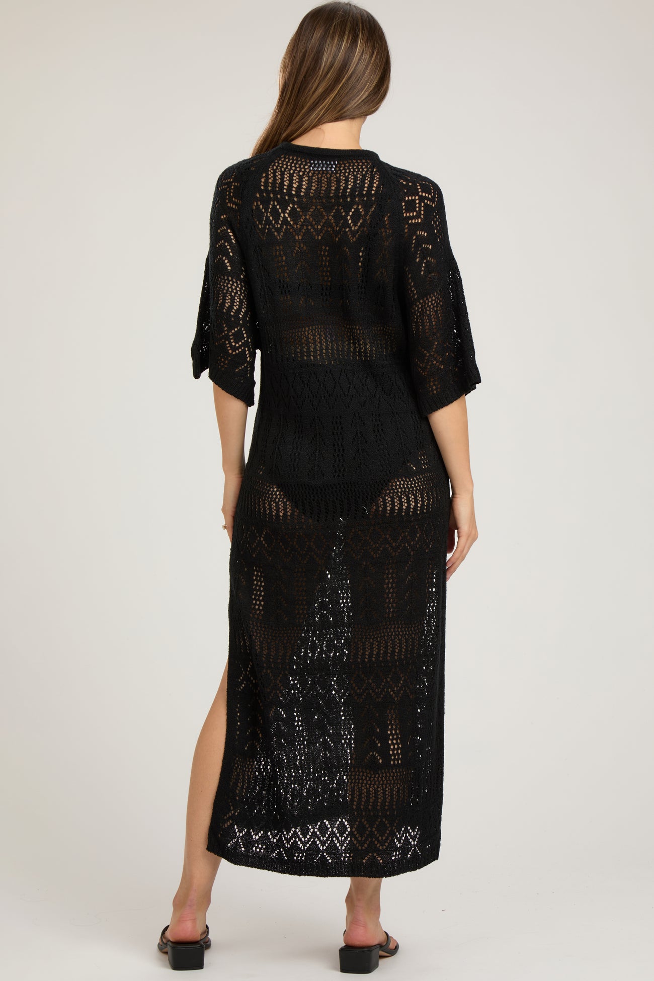 Black Open Knit Front Tie Side Slit Midi Maternity Swim Cover Up
