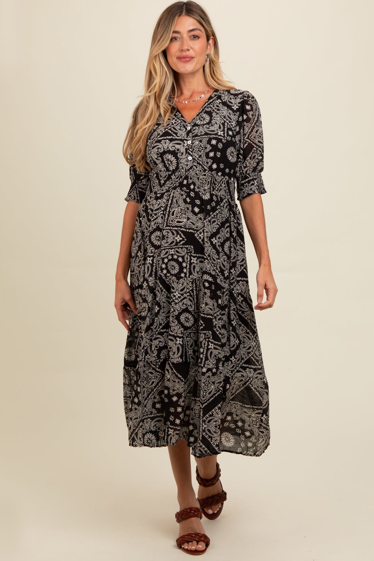 Black Paisley Button Front V-Neck Tiered Maternity Midi Dress