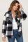 A thick knit shirt jacket in a plaid print with a collared neckline, button front closure, and two front pockets.