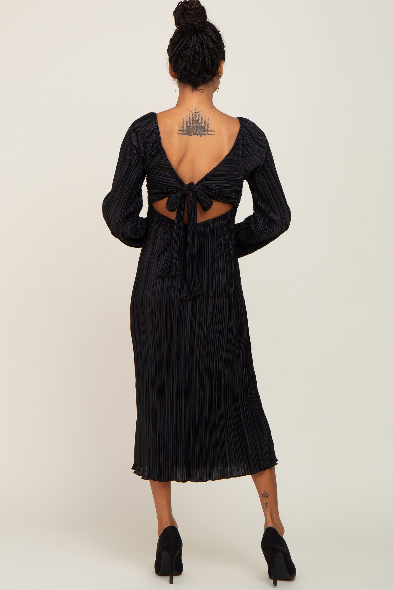 Black Pleated Front Cutout Back Tie Midi Dress