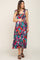 A printed maternity midi with adjustable shoulder ties, a smocked bodice, and a lined skirt.