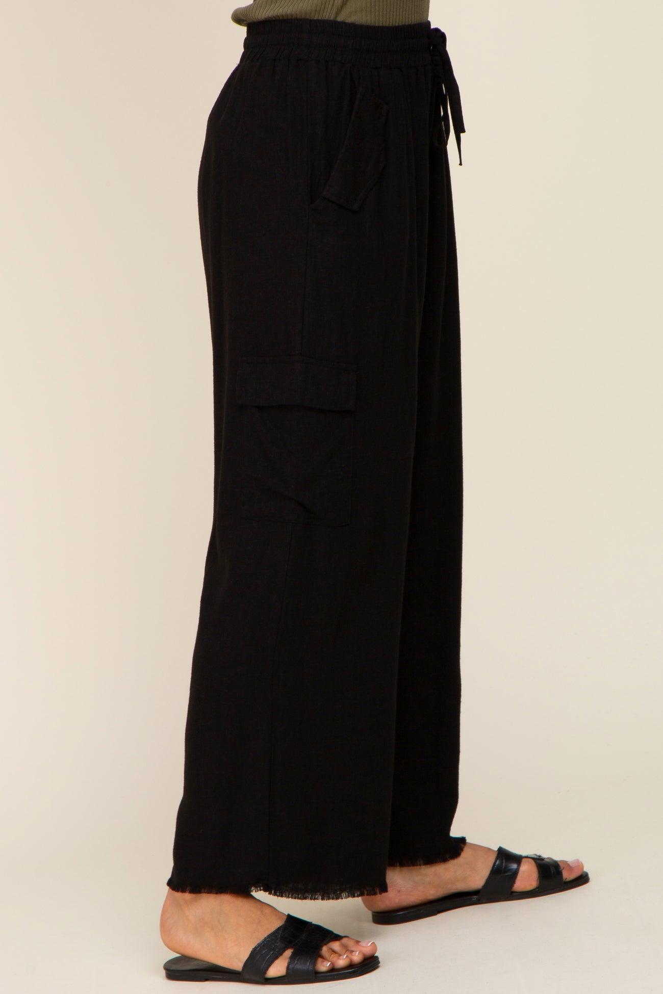 Details A pair of linen pants with an elastic drawstring waistband, side pockets with a faux flap, side leg pockets, and a raw hem. Content + Care
