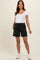 A solid pair of maternity shorts with an elastic waistband with drawstring, raw hem accents and hem. Pocketed.