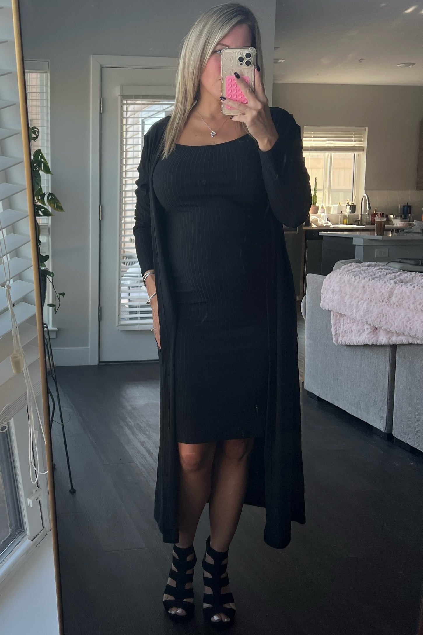 A solid ribbed maternity cardigan and dress two piece set. Dress straps are not adjustable.