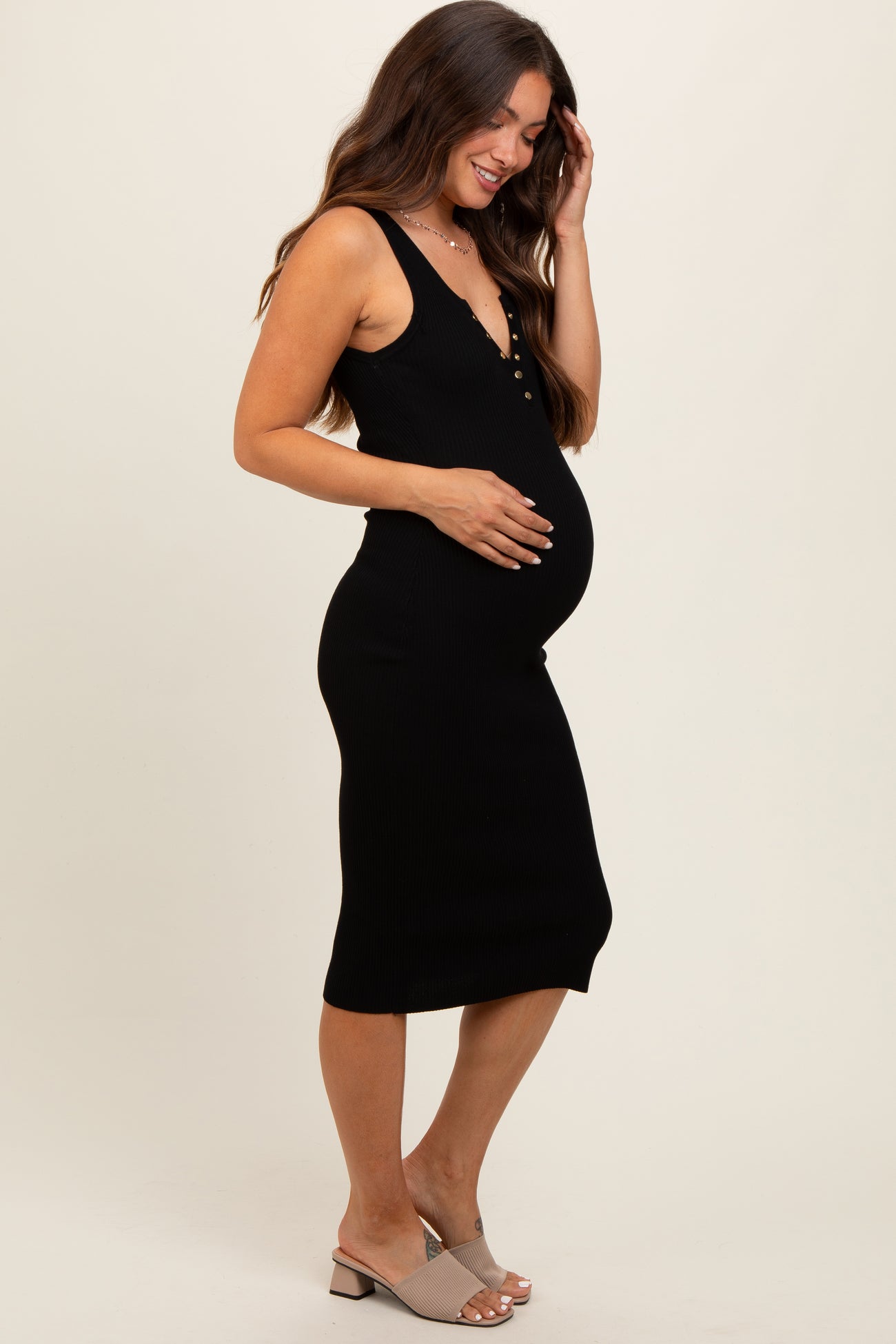 Black Ribbed Fitted Sleeveless Snap Button Maternity Dress