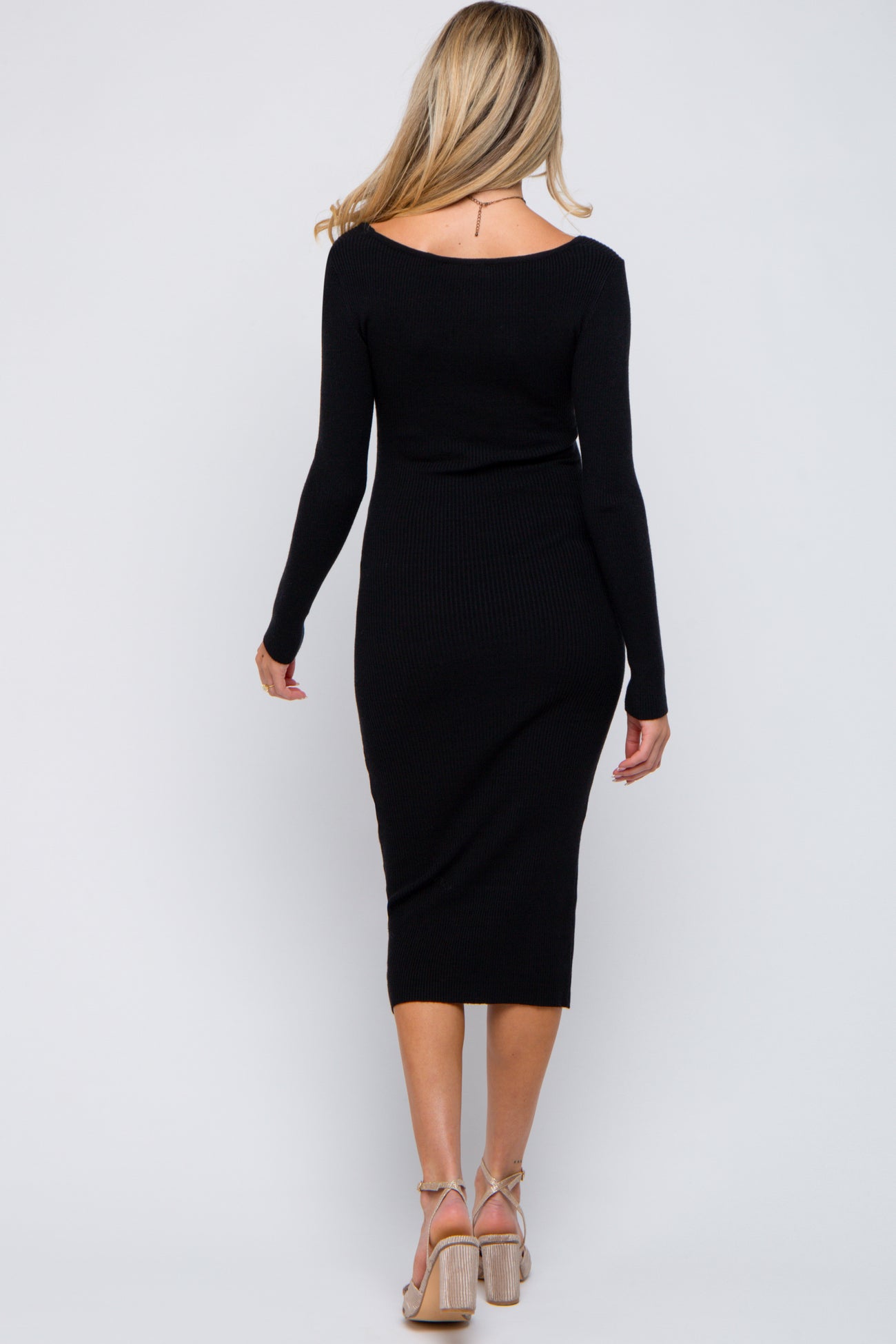 Black Ribbed Long Sleeve Maternity Midi Dress