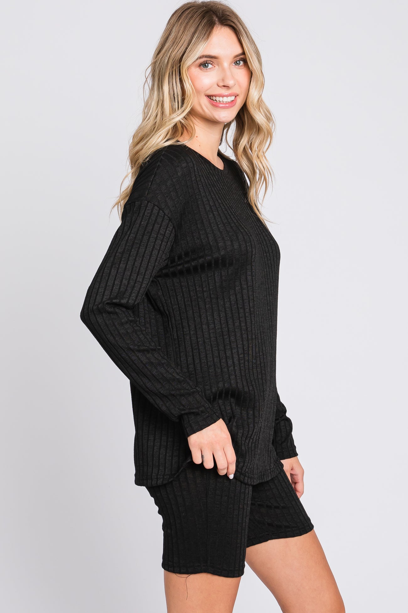 A heathered ribbed set. Top features long sleeves and a rounded neckline. Fitted shorts.