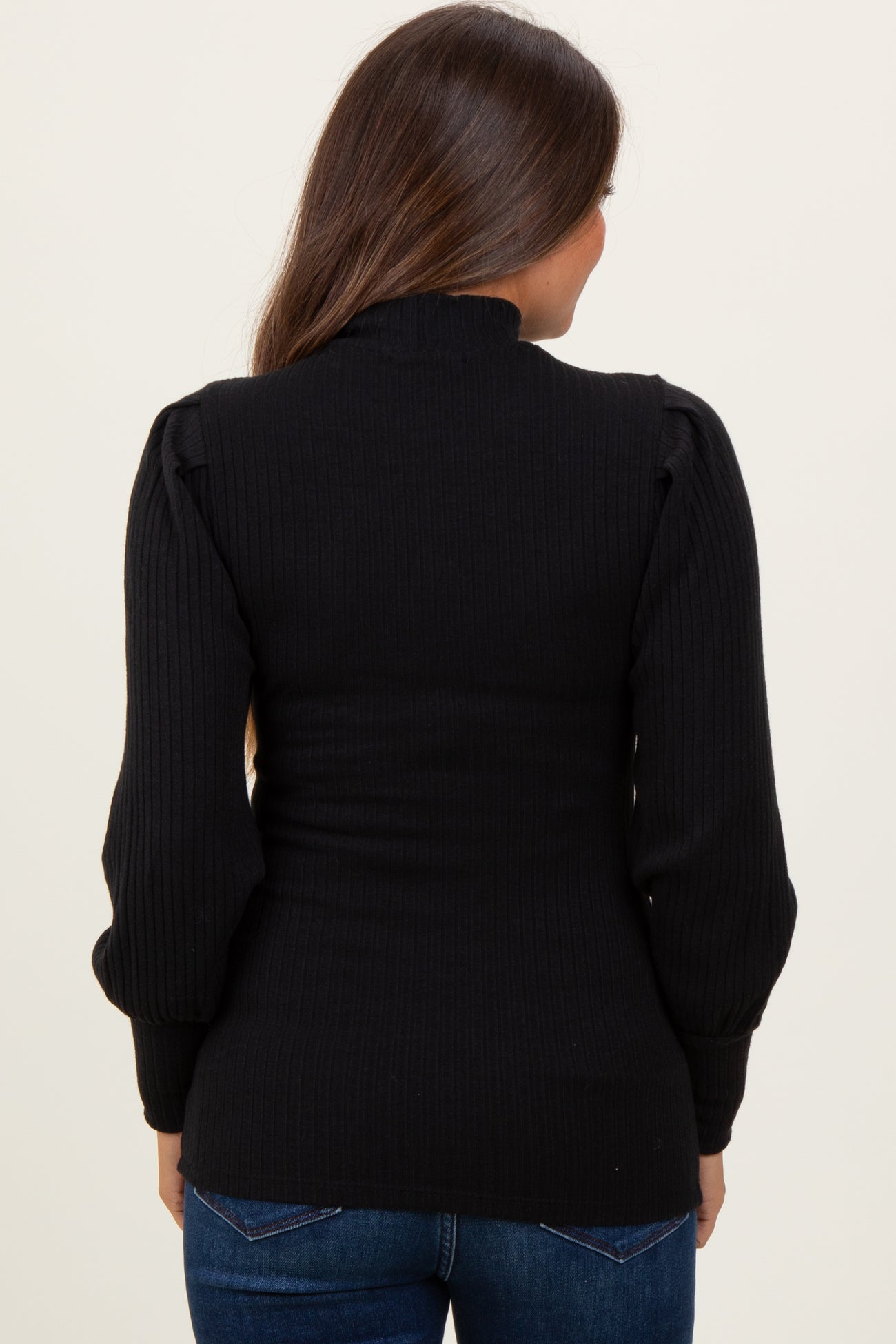 Black Ribbed Mock Neck Bubble Sleeve Maternity Top