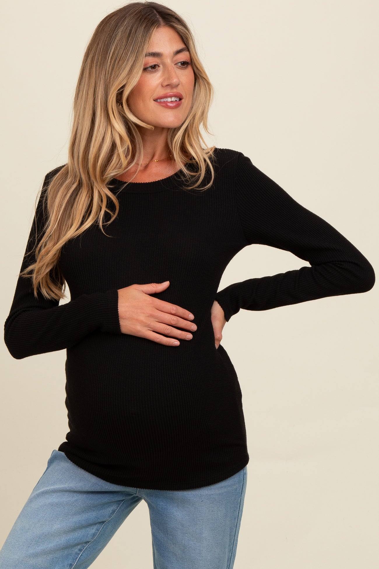Meet your new go-to pregnancy staple: our Black Ribbed Scoop Neck Long Sleeve Maternity Top. Crafted from ultra-soft, stretchy fabric, this classic tee comfortably hugs your curves and grows with your bump for a flattering fit at every stage. The ribbed texture and scoop neckline add a touch of modern style, making it perfect for layering or wearing on its own. Dress it up with your favorite maternity jeans or keep it casual for lounging at home. Designed for both comfort and versatility, this must-have top transitions effortlessly from season to season. Machine washable for easy care.