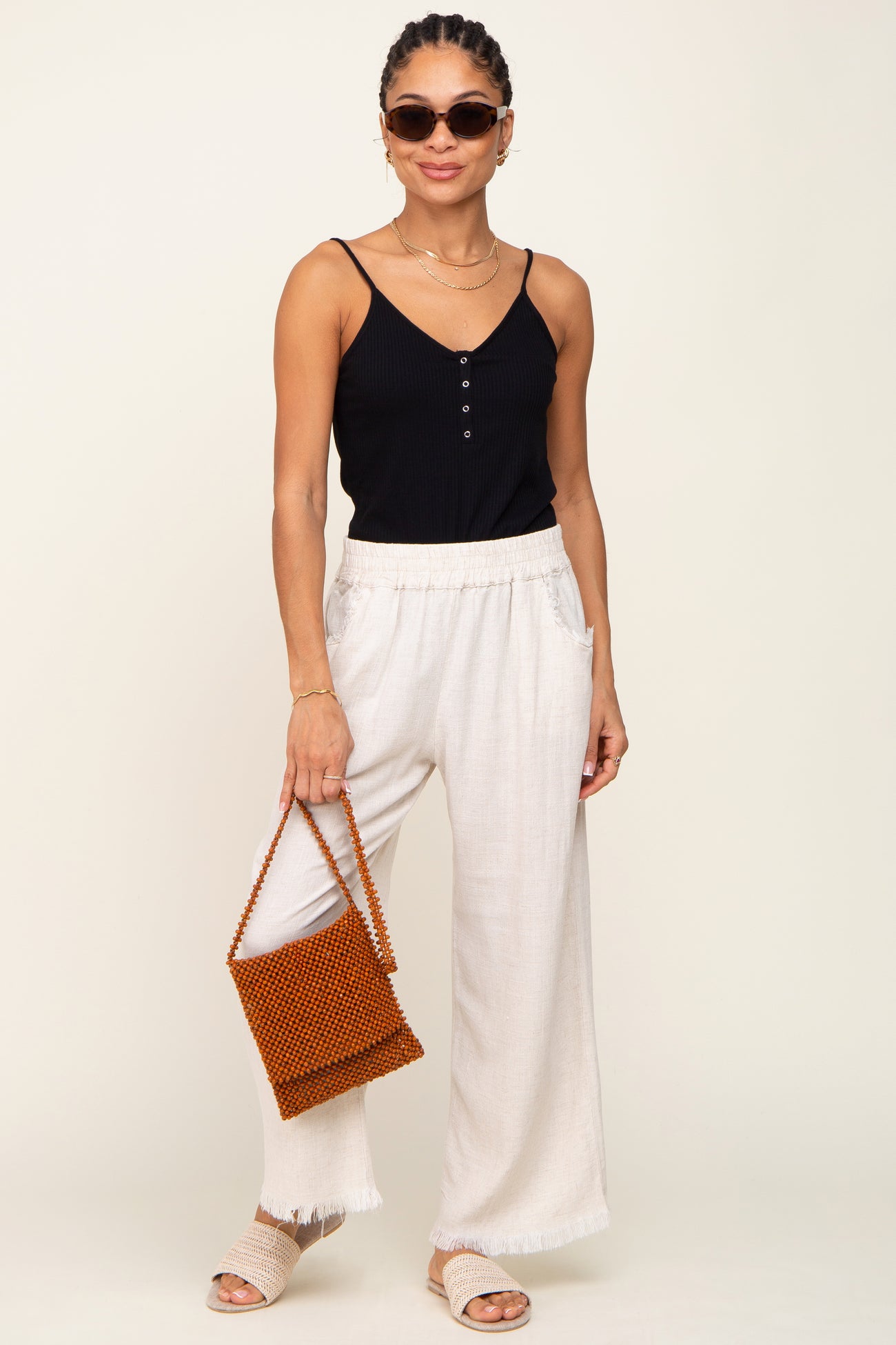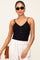 A solid ribbed cami top with adjustable straps and a snap button front detail. Rounded hem.