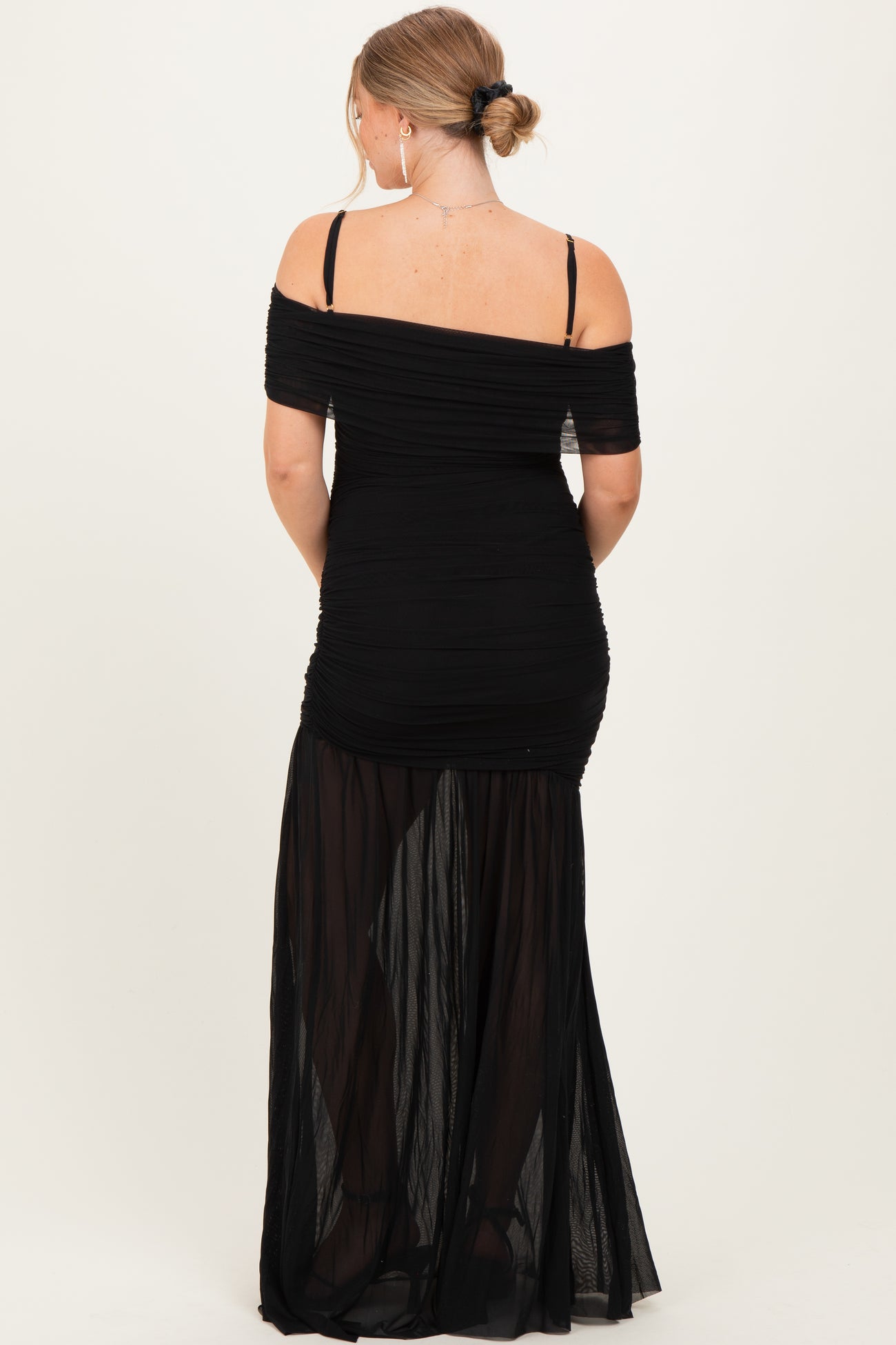 Black Ruched Mesh Off Shoulder Maternity Maxi Dress