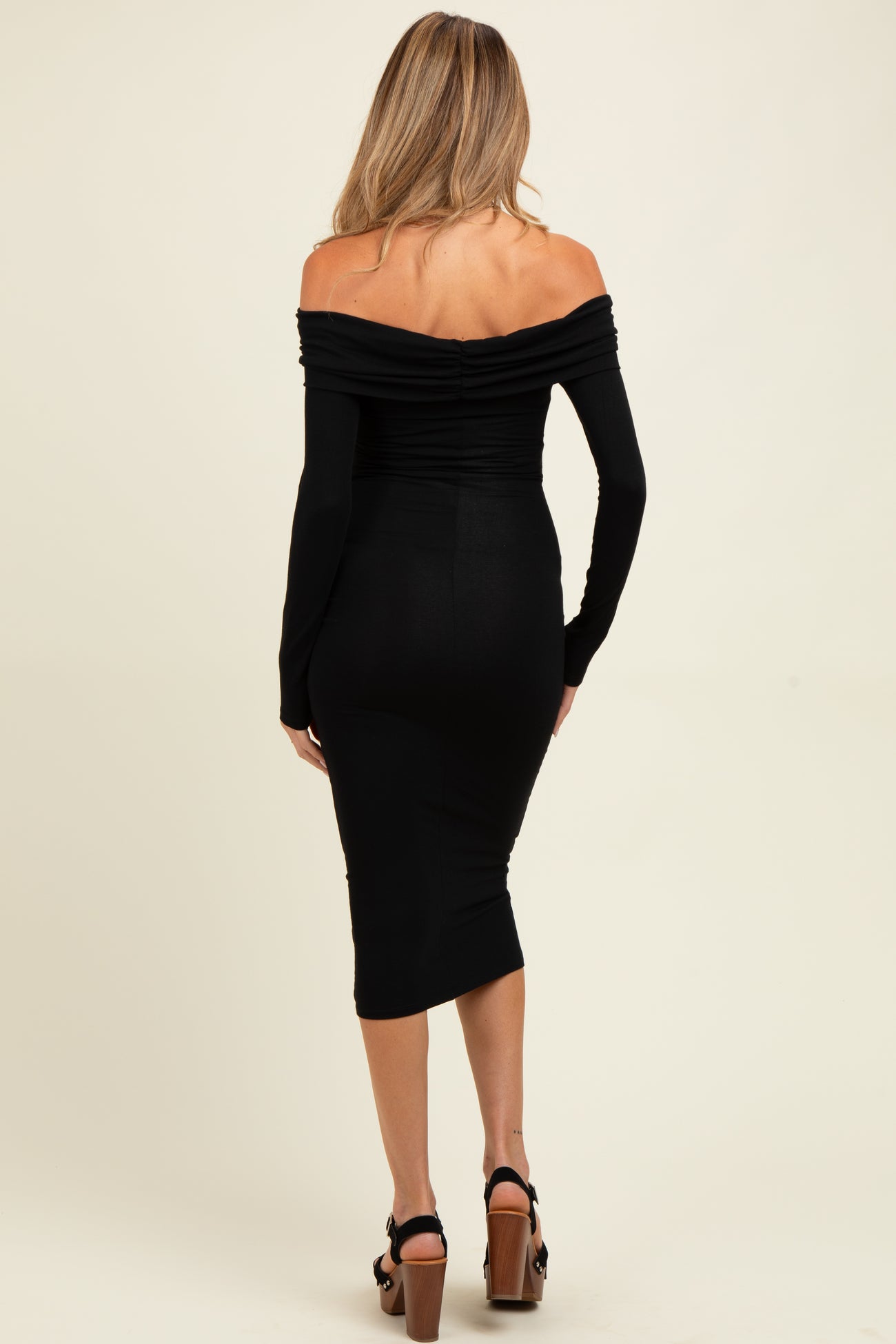 Elevate your maternity style with our Black Ruched Off Shoulder Maternity Dress. This elegant midi dress features a flattering off-shoulder neckline and delicate ruching that accentuates your baby bump beautifully. Crafted from soft, stretchy fabric, it offers comfort and support throughout your pregnancy. The long sleeves add a touch of sophistication, making it perfect for special occasions or evening outings. Pair it with your favorite heels or flats for a chic, effortless look. Embrace stylish comfort while celebrating your pregnancy in this must-have maternity dress. Available in multiple sizes to fit and flatter every bump.