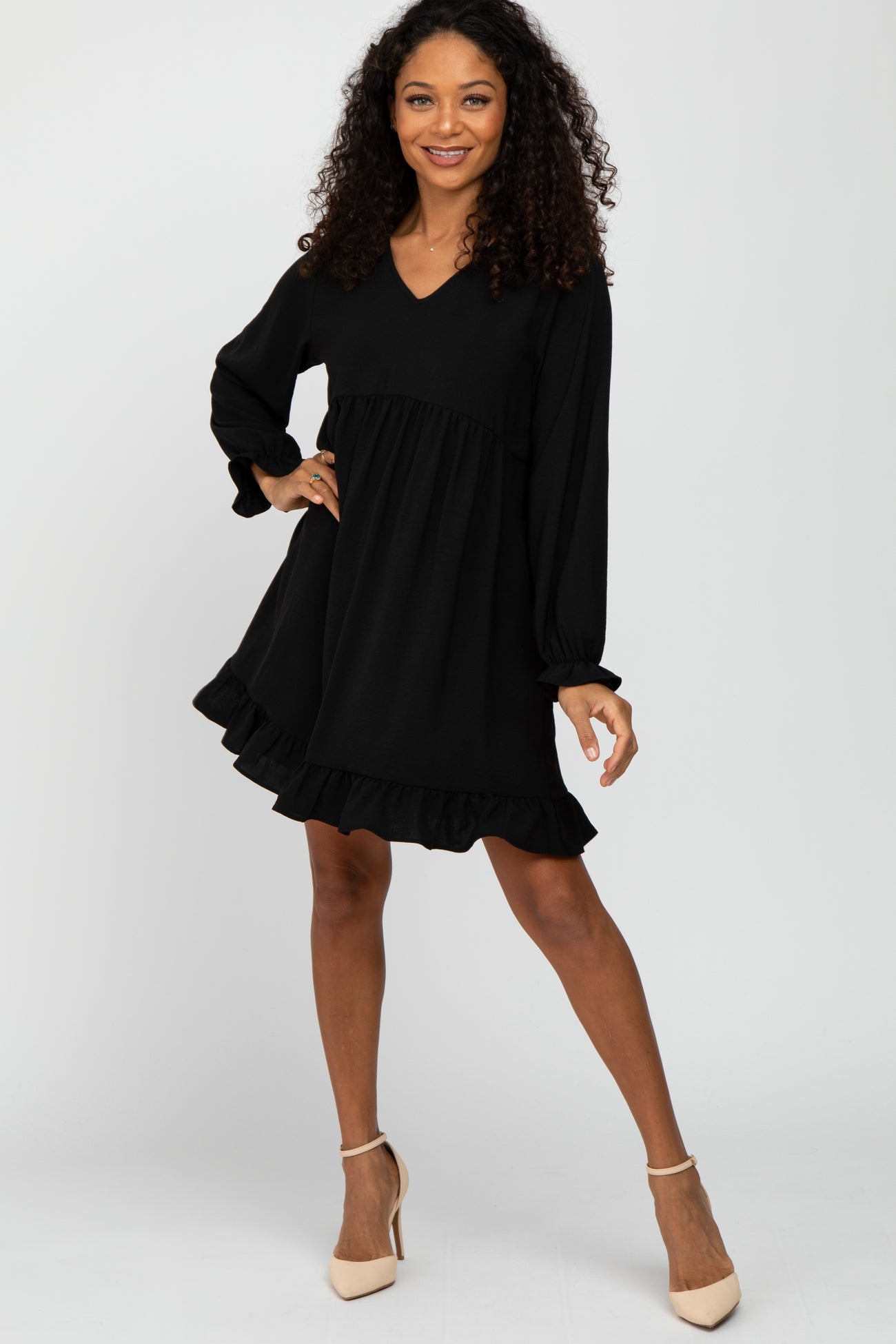 Details A solid dress featuring long cinched sleeves, a v-neckline, a bottom ruffle hem, and side pockets Content + Care