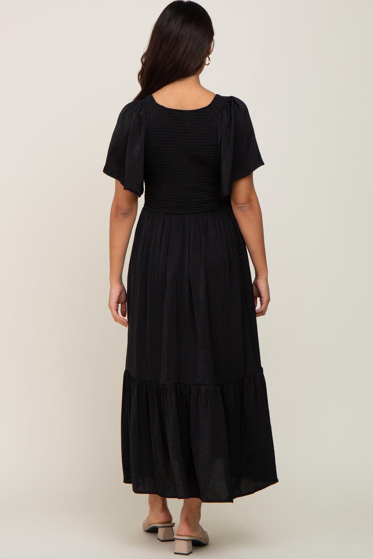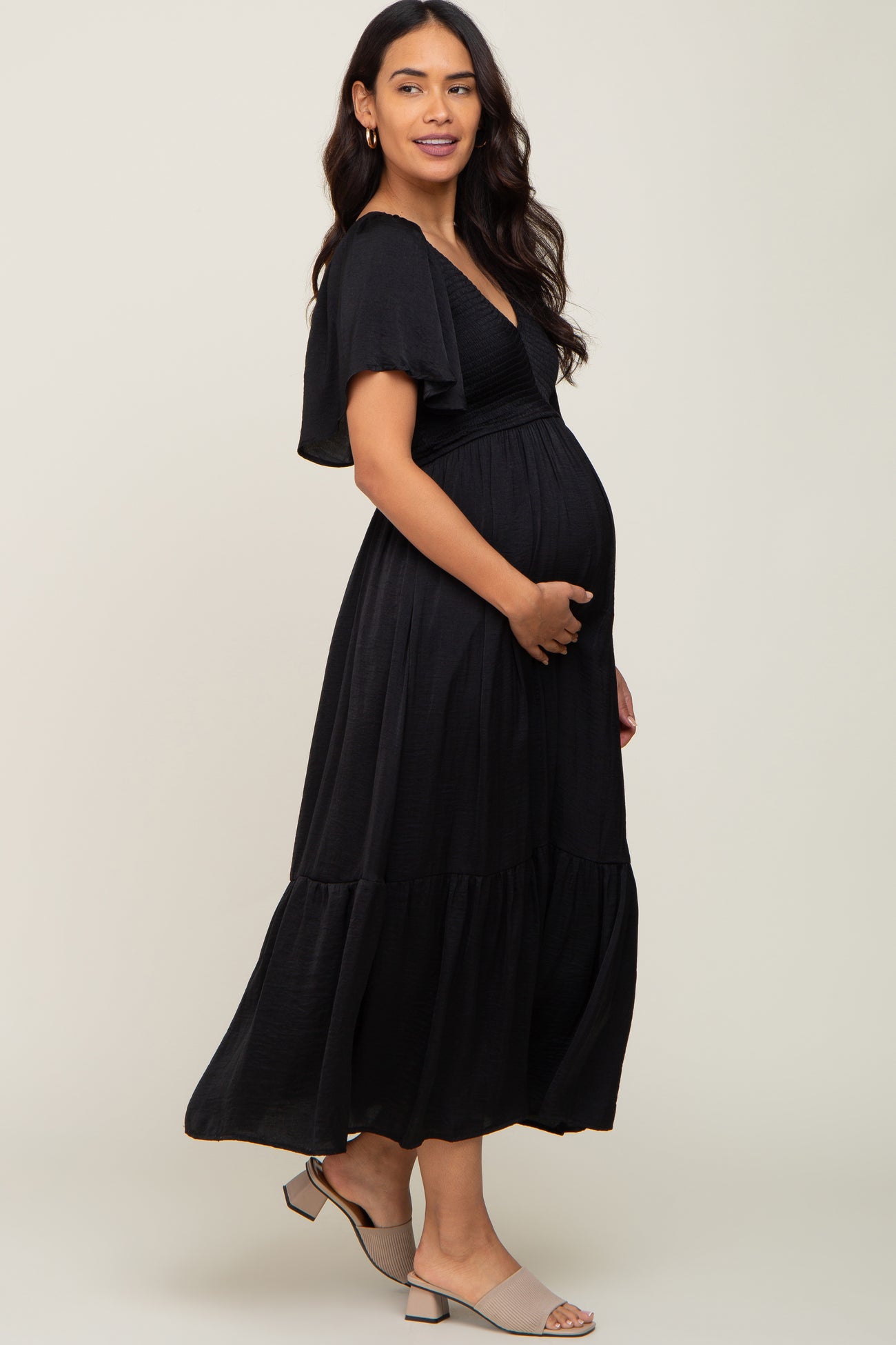 Details A solid satin maternity midi dress featuring short sleeves, a smocked top and a ruffle hem. Skirt is double lined. Content + Care
